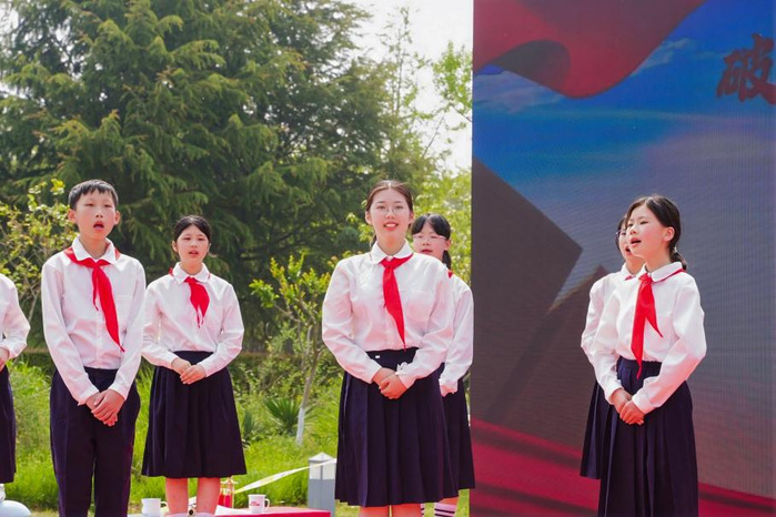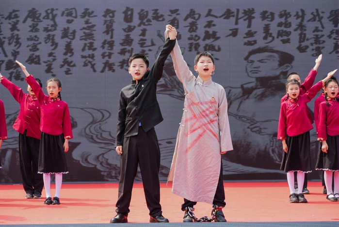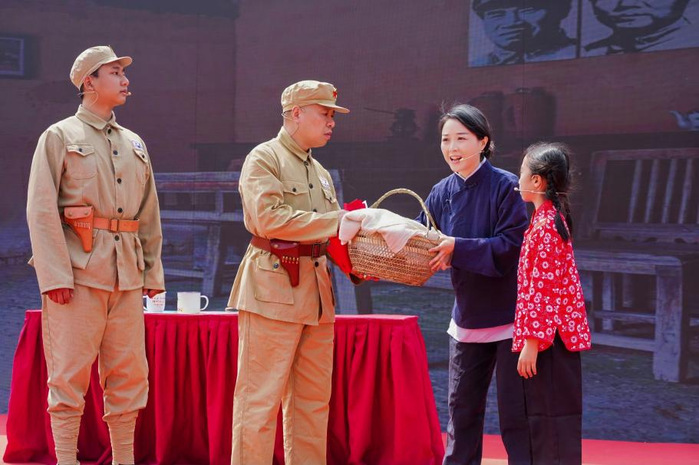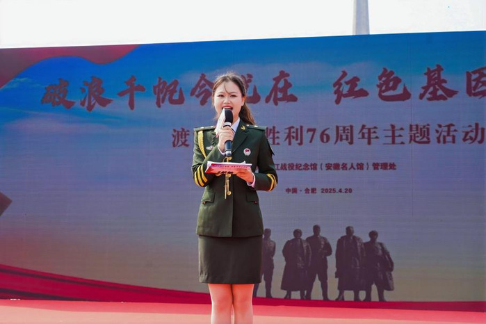 活动在庄严肃穆的渡江战役历史影像中拉开帷幕,来自万慈小学、合肥市师范附属小学的师生共同参与情景朗诵环节,以革命烈士家书、诗词为载体,用铿锵之声再现“军民团结、奋勇争先”的渡江精神。在《我送亲人过大江》原创情景剧中,学生们以沉浸式表演还原军民携手突破长江天险的壮烈场景,陈毅将军“春水方生濡须口,大军从此过江东”的诗句激荡全场。