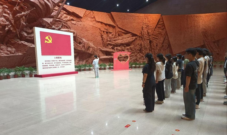 活动伊始,学生党员们首先参观了馆内珍贵的历史图片、文献资料以及革命遗物。纪念馆内展览内容丰富详实,每一个展区都生动地还原渡江战役的激烈场景,意义深远。讲解员详细讲述了渡江战役的背景、过程及其对新中国成立的重要影响。随后学生党员们在党支部书记的带领下进入了纪念馆的中央大厅。学生党支部书记为预备党员学生佩戴党徽,并表示,党徽是党员身份的象征,是我们对党忠诚的标志,佩戴党徽,就是要时刻牢记党员责任,践行党的宗旨。