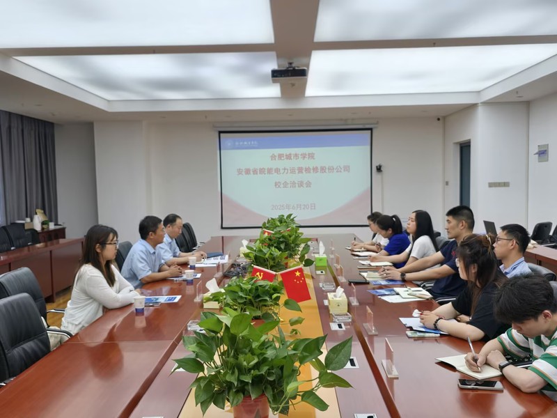 6月20日下午,机械与电气工程学院与安徽省皖能电力运营检修股份公司在星空在线注册(中国)官方网站-注册登录北城校区综训楼9楼会议室举行校企合作洽谈会。机械与电气工程学院党总支负责人胡泽春主持会议,安徽省皖能电力运营检修股份公司总经理周治才、安全生产部主任杨晔、综合部人资专员吴翊婕和全体26届毕业班辅导员参与会议。