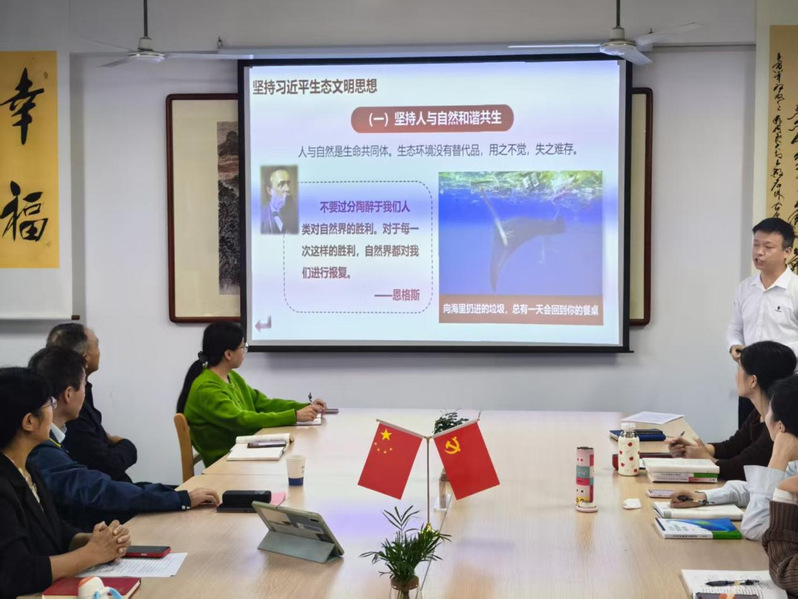 会上,干平老师围绕“习近平生态文明思想”专题,作了内容详实、逻辑清晰的教学展示。习近平新时代中国特色社会主义思想概论教研组老师进行交流发言,研讨创新教学手段和教学方式,以提升教学质量。