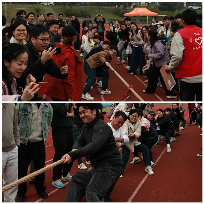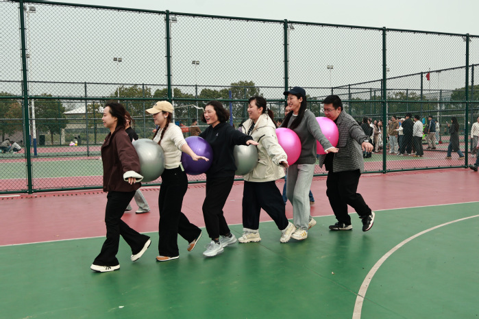 比赛正式开始后,体育场瞬间变成了欢乐的海洋。在“凝心聚力竞速” 项目中,各参赛队伍怀抱着球,步调一致地向终点迈进,整齐的口号声和欢快的笑声此起彼伏;“同心鼓” 里,选手们默契配合,小心翼翼又有条不紊,展现了极强的团队协作能力;“拔河比赛” 更是将现场气氛推向高潮,参赛教职工紧握长绳、齐心协力,场外观众的加油声、呐喊声震耳欲聋,每一声呐喊都充满了对团队的支持与鼓励。
