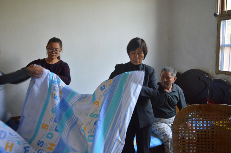 上午8时,志愿者们在图书馆门前集合完毕,志愿者们带着六十件被套和水果来到敬老院,敬老院院长褚桂英和老人热情地欢迎志愿者的到来。敬老院的工作人员首先为老人分发了被子,褚桂英和志愿者帮助老人更换好新被套,老人们看到温暖的新被子整洁的铺好,脸上都充满了笑容。