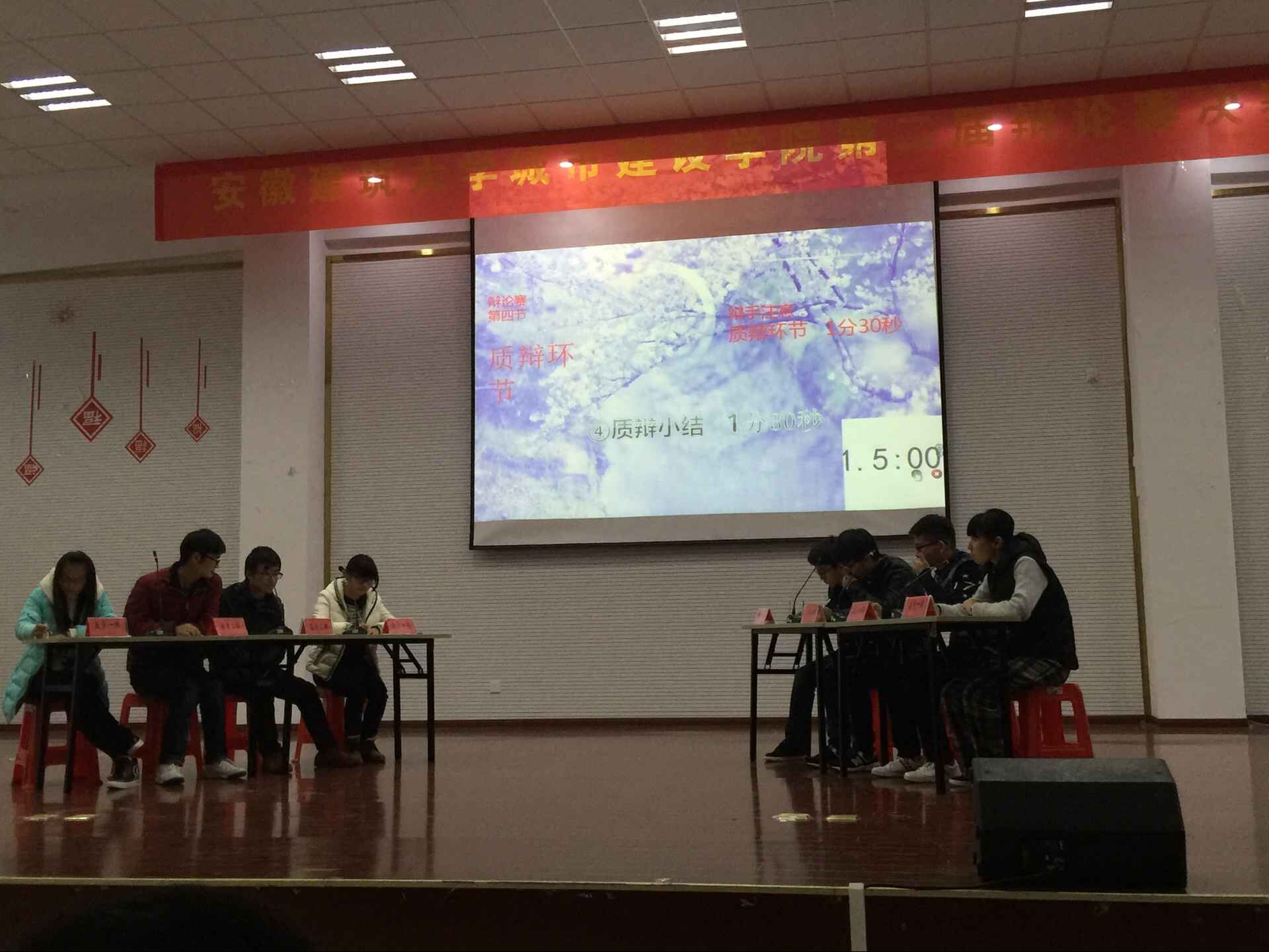 安徽建筑大学城市建设学院辩论赛决赛于11月29日晚6点在图书馆二楼报厅拉开了帷幕。经过一个月的角逐,各系最终脱颖而出的共八支代表队在今晚一决高下。到场的评委有:团委书记王利康、机电辅导员刘文君、办公室吴晶晶、团委老师任阳军以及建艺系老师李强。