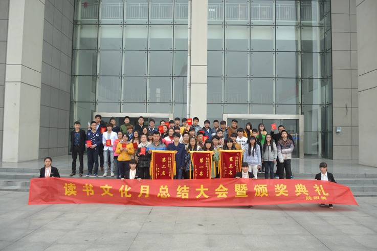 本次大会由学生处副处长林岳担任主持人,共邀副院长程勇、学生处处长候为民、团委书记王利康,各系辅导员以及学生会相关成员,学生代表参加。当然,还有最耀眼的各项活动得奖者参加了此次总结大会。首先,王利康书记对今年读书月举行的一系列活动进行了简单的介绍及总结。今年读书月的形式多样,异彩纷呈,同学们也踊跃报名,积极参加。有些活动煅炼口才,如辨论赛、演讲比赛;有些活动考察写作能力,如征文比赛;有些活动与书亲密接触,如早读、讲座;还有主题班会、黄麓设计大赛等特色活动。通过这些活动,提高了学生们的思想觉悟和文化底蕴,营造了书香缕缕满校园的文化氛围。激励我们养成多读书、乐读书、好读书的习惯。紧接着,候为民处长向我们宣布读书月系列活动获奖人员及队伍的名单。接下来,程勇副院长进行了精彩的发言。他用本年读书月活动中的亲身经历告诉我们“学风四戒”,即戒满,戒骄,戒惰,戒浮。同时,他用一句“鸟欲高飞先振翅,人要上进先读书”书告诉我们读书的重要性。最后,获奖人员与院领导进行了合影留念。