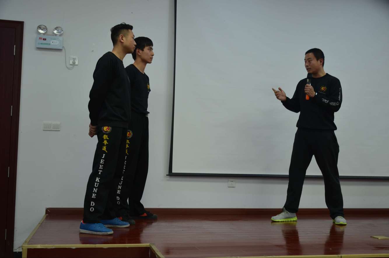 接下来张老师同几个陪练向在场的学生展示了截拳道的招数,同时也邀请在场的学生上台进行实战,在一系列实际操作中学生明白了如何将截拳道与实战相结合,大大提高了学生强身健体的意识,同时也提高了他们对武术的兴趣。