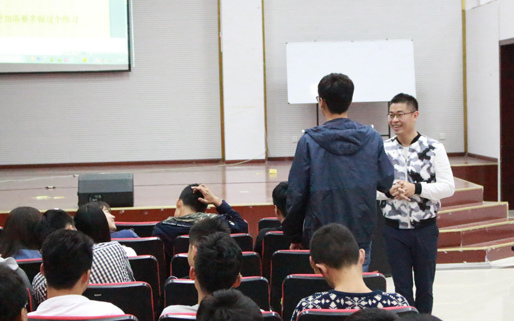 许旭嘉现场为同学指导,去年获得“校园好声音”冠军的刘洋浩和填词改编《城建版南山南》邱振阁等同学受到专业点评。通过现场指导后,同学们都有明显提高。通过欣赏不同歌星和不同音色的歌曲,让学生们更直观了解不同声部的音色特点。许旭嘉还针对唱歌时高音上不去,低音下不来等常见问题给学生一一做解答。