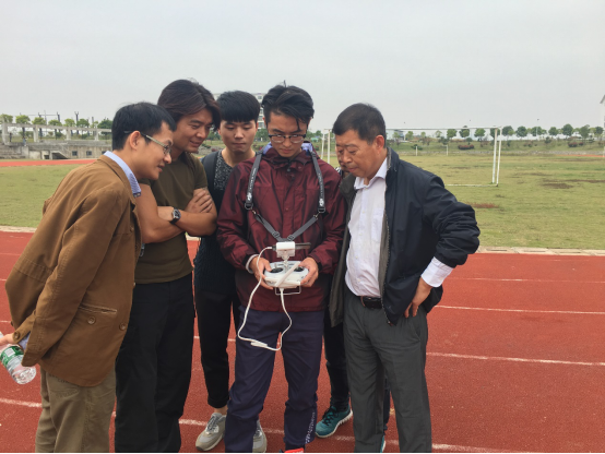 当我走近后,就隐隐看见一架精致的小飞机正逐渐从塑胶跑道上起飞升空。经过了解才知道这是用来航拍的无人机,而驾驶这架无人机的是孙老师。在一旁围观的,不仅仅是同学,还有执行董事赵治滨与学生处副处长林岳。孙老师见大家兴趣这么高,也就不嫌麻烦的为大家一一讲解了无人机的相关原理,让大家在围观的过程中,也学习到一些其他技能!