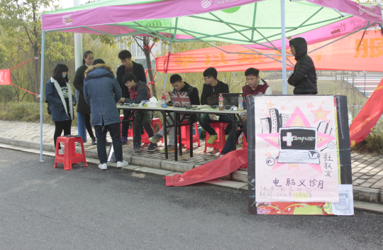 乘时代之浪潮,创历史之先河。寓“科技性,学术性,新颖性”为一体,在院团委的指导下,我院计算机爱好者协会于11月30日在我院食堂对面成功举办了电脑义诊月活动。协会的各个成员认真的帮助同学们解决电脑存在的问题,得到了许多同学们的参与与认可,现场十分热闹。