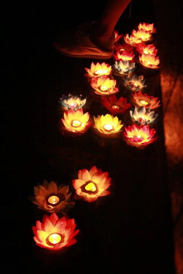 晚上8:30,活动工作人员发放完河灯,同学们手捧着火光闪烁的河灯,一个接一个的放入湖心广场的小河里,寄托着对家人亲友的思念与祝福。