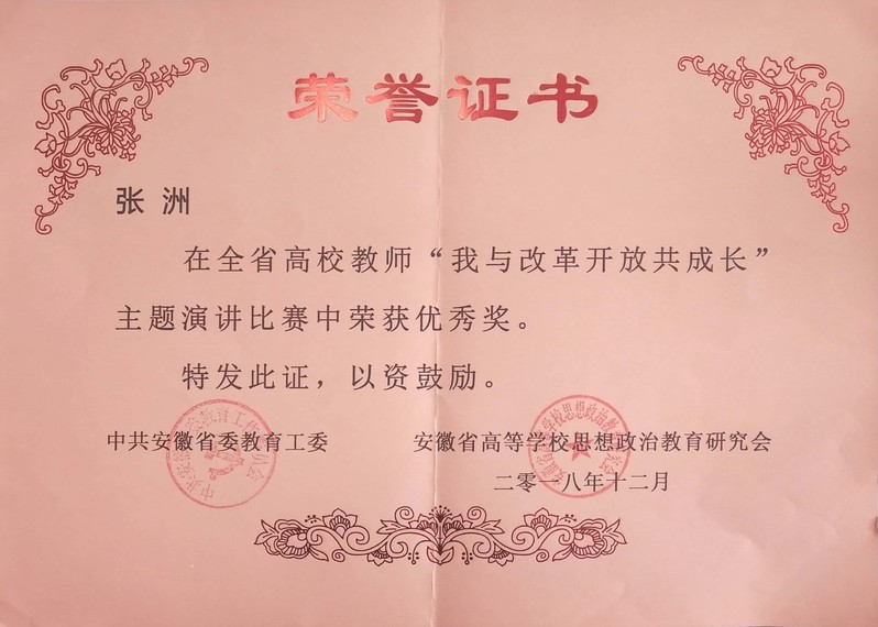 比赛分为校赛、预赛和决赛三个阶段。在院内选拔的基础上,来自全省高校的122名选手参加网络视频预赛,经专家评选,共有30名选手参加现场决赛。经过筛选,安徽建筑大学城市建设学院推荐张洲老师代表学院,参加省赛。来自全省各高校教师以改革开放的见证者、参与者、受益者为视角,结合本职工作,畅谈改革开放以来国家、家乡、个人的今昔变化及取得的优异成绩,抒发了对改革开放的拥护、热爱之情。最终张洲老师荣获“我与改革开放共成长”演讲比赛优秀奖。