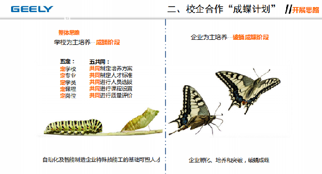 此次宣讲会的主讲吉利集团校企合作班主任王宜恒先生首先询问了学生对于吉利的了解,通过介绍吉利集团的发展历程、管理架构、2018至2019年集团营收额、销量目标、全球工厂布局等,深入浅出地讲解了校企合作及技能人才培养体系“成蝶计划”的素质培养、岗位胜任、能力提升、能力拓展、化蛹成蝶的五个阶段。