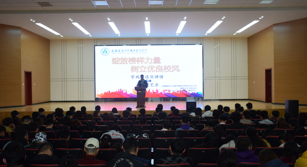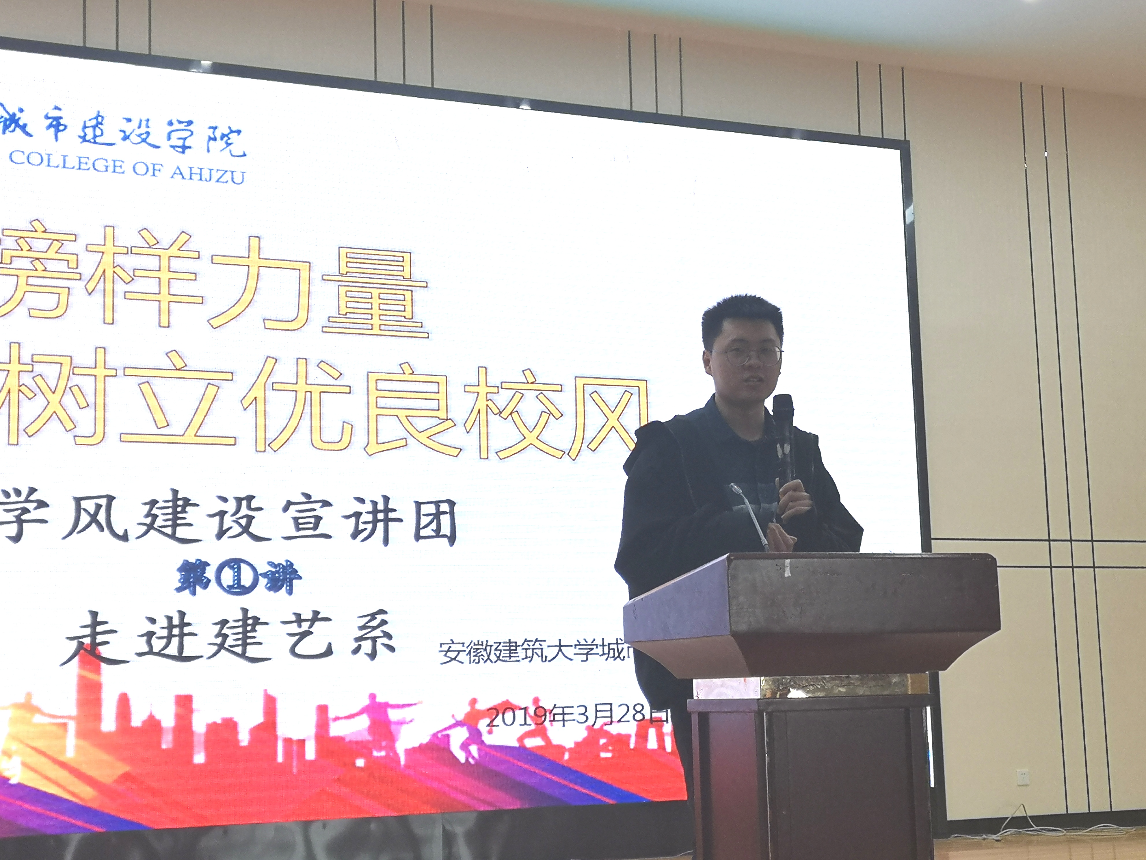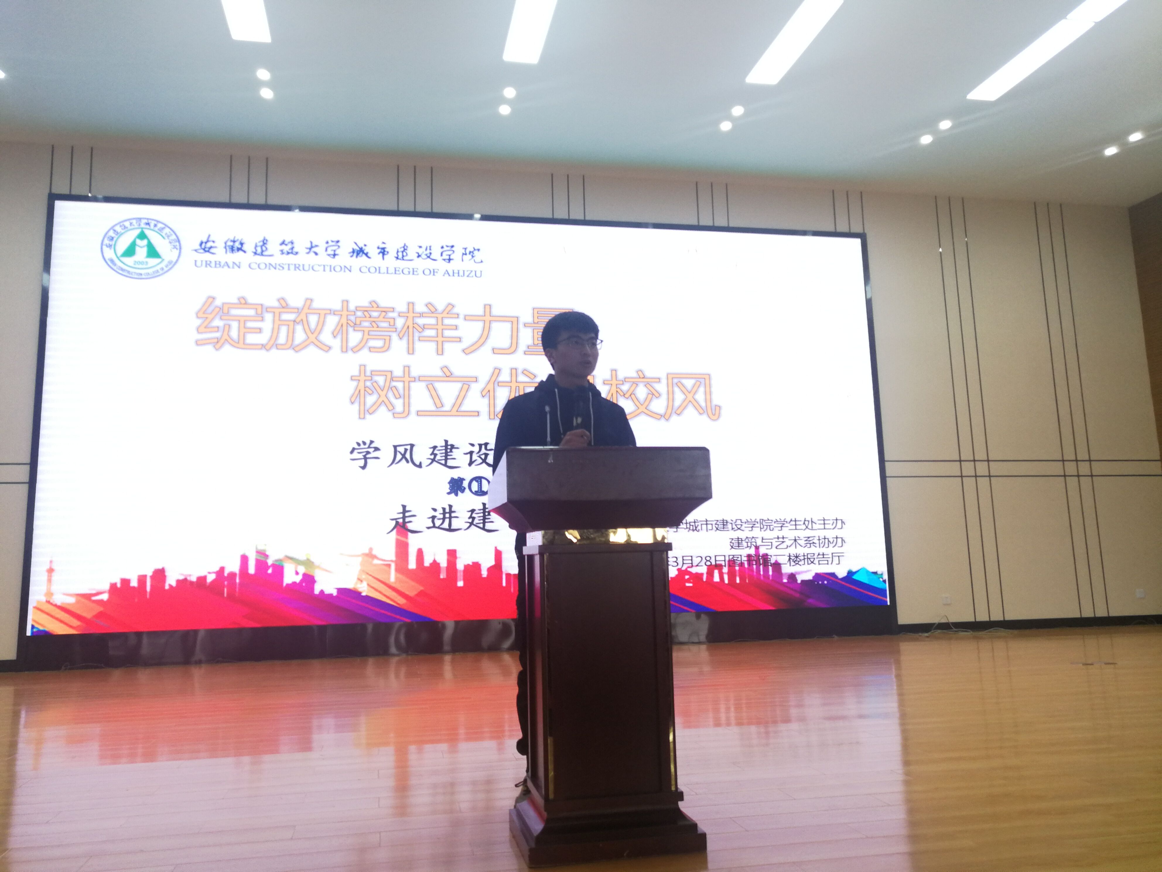 328日,安徽建筑大学城市建设学院“绽放榜样力量,树立优良校风”学风建设宣讲活动在图书馆二楼报告厅圆满举行,学生处、建筑艺术系老师,宣讲团成员、建筑艺术系学生参加了本次活动。5位同学为建艺系的学弟学妹们分享了他们的学习、生活经历,本场宣讲会由高宇老师主持。