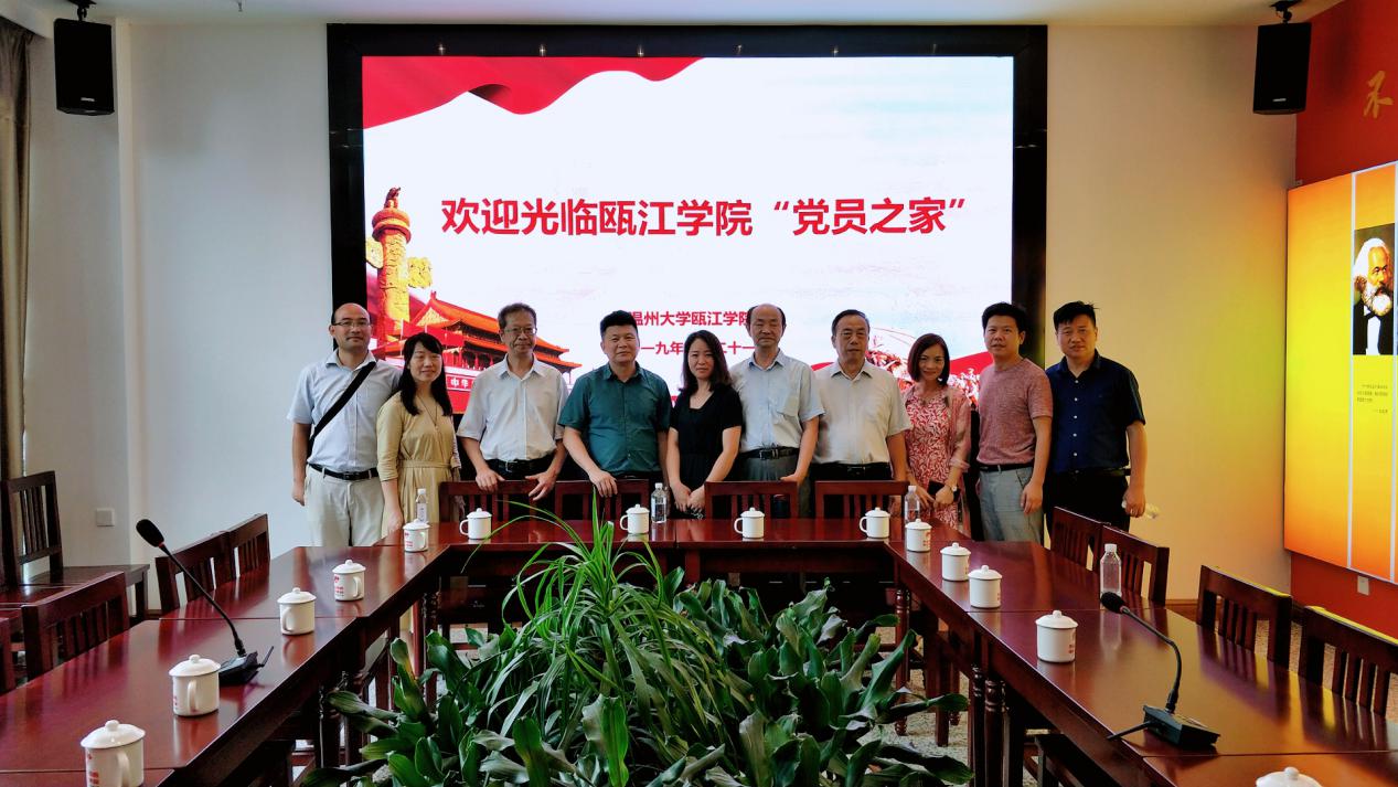 2019年7月21日,我院董事长、党委副书记林瀚,党委书记李义宝,党委副书记魏宪友,副院长王志建,副院长田园,带领“两优一先”受表彰教职工、基层党总支(党支部)书记及各部门负责人一行34人,赴温州大学瓯江学院调研学习。瓯江学院党委书记王定福、副书记林盛光及相关部门负责人热情接待。
