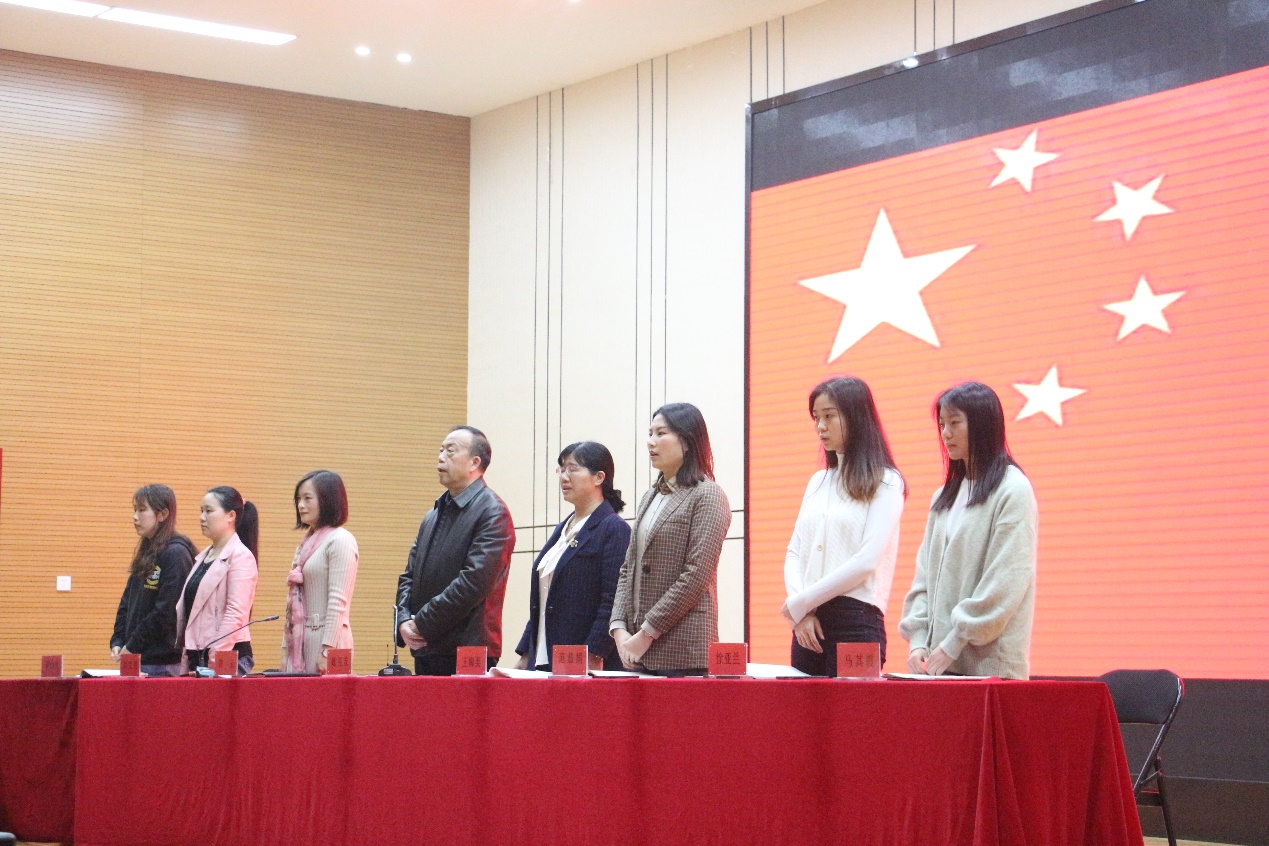典礼第一项,奏唱国歌。参加党课的全体师生肃然起立,面向国旗奏唱国歌。在整个过程中,全场氛围严肃认真,庄重俨然。