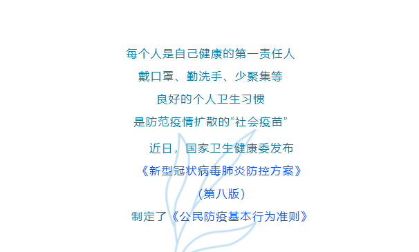 近期,高校纷纷开学,秋日的校园也因老师们、同学们的回归变得热闹起来,焕发出勃勃生机!但境外疫情仍在扩散,新冠病毒变异毒株德尔塔传染性更强、载毒量更大,当前疫情防控形势依然严峻复杂,输入风险、防控压力仍然较大,常态化疫情防控工作丝毫不能松懈,老师们、同学们在返校来校途中和来校后,仍须采取科学措施,做好个人防疫防护。为此,请老师们、同学们谨记《公民防疫基本行为准则》,以保护个人、家人和他人健康、安全。
