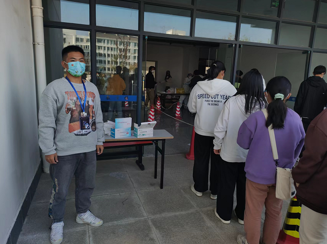 此次节后全员核酸检测,有着丰富组织调度经验的后勤保卫处刘文峰同志带队负责滨湖校区,他带着校卫队从提前布置场地、设置警戒带和安全检测通道等,到现场引导学生佩戴好口罩分批在检测点外有序排队进入,按照1米间距指引,依次排队扫码、核酸采样、安全离开离场,全程负责,全程服务,确保了核酸采样工作井然有序地进行。