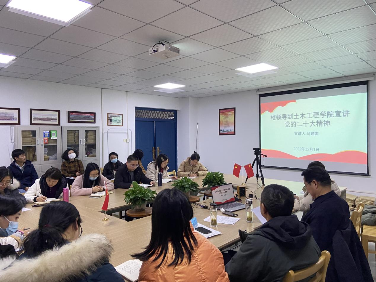 本网讯:12月1日下午,校党委委员、副校长马建国在实验北楼302会议室为土木工程学院全体教师宣讲党的二十大精神。土木工程学院班子成员、全体教师和辅导员参加宣讲会。