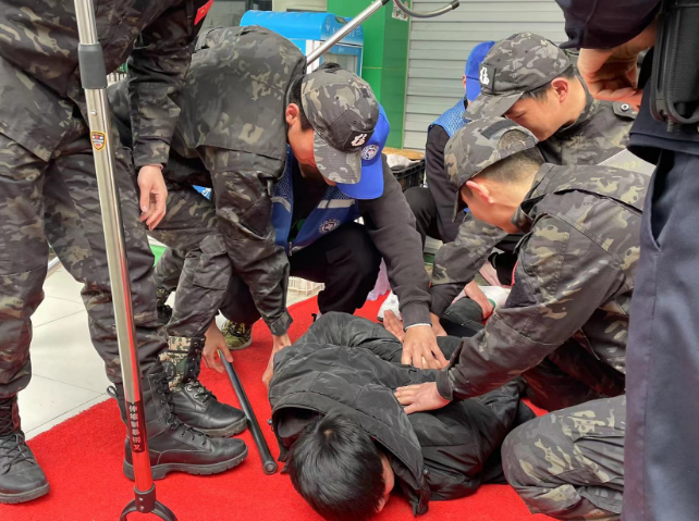 演练过程中,保安队员与校卫队员遵照校园反恐防暴应急预案,使用“警棍、钢叉、防暴盾牌”等防御器材,处理了“车辆冲撞”与“持刀行凶”两场模拟突发事件,有效协助警察控制歹徒,整个演练处置过程参与人员分工明确,配合默契,处置手段合理高效。
