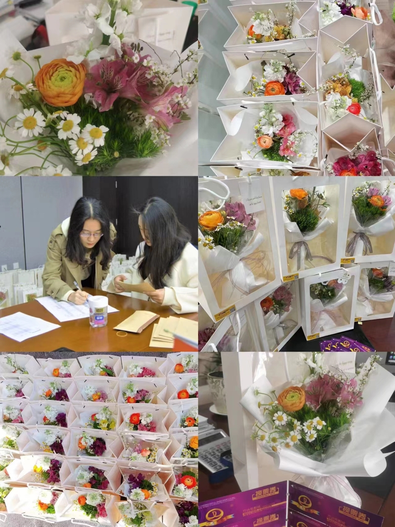 3月8日上午准备工作开始,校工会组织各分工会为女性教职工分发电影票和花束,鲜花朵朵,送上浓浓的节日关怀与祝福。