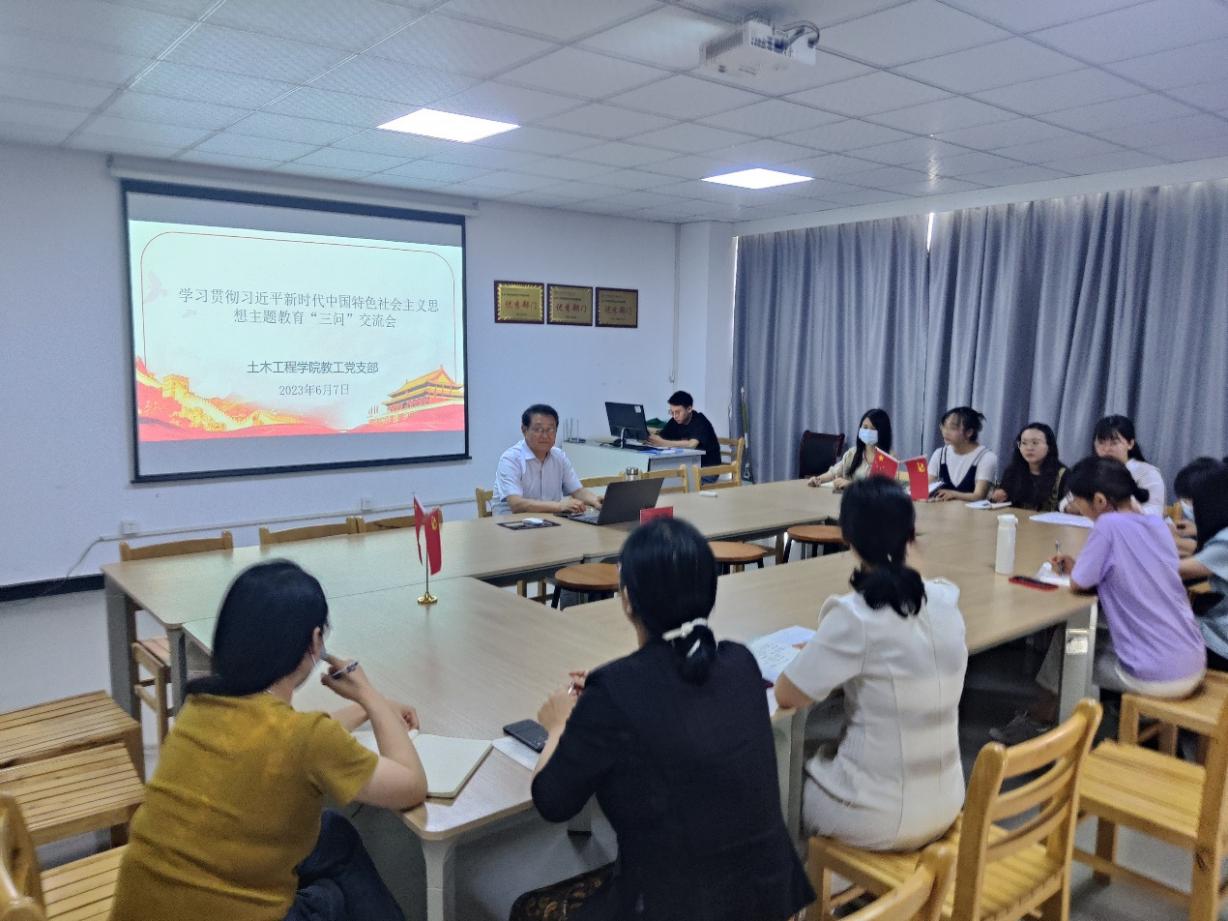为推深做实学习贯彻习近平新时代中国特色社会主义思想主题教育,6月7日,土木工程学院教工党支部召开学习贯彻习近平新时代中国特色社会主义思想主题教育 “三问”交流会,校党委委员、副校长马建国,土木工程学院全体教工党员参加学习交流。