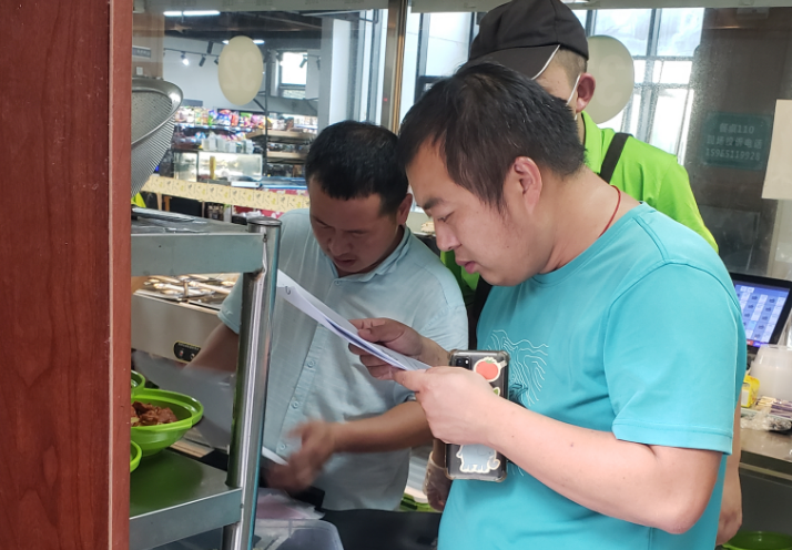 检查过程中,检查小组先后走进食堂前厅、后厨操作间、消毒间、洗菜间、食材仓库等,采取“看、问、查”的方式进行检查。重点查看了食品加工场所环境是否卫生、食品加工贮存条件是否符合要求、人员健康状况是否良好、食品留样环节是否规范,以及食品原料进货台账是否记录完整。
