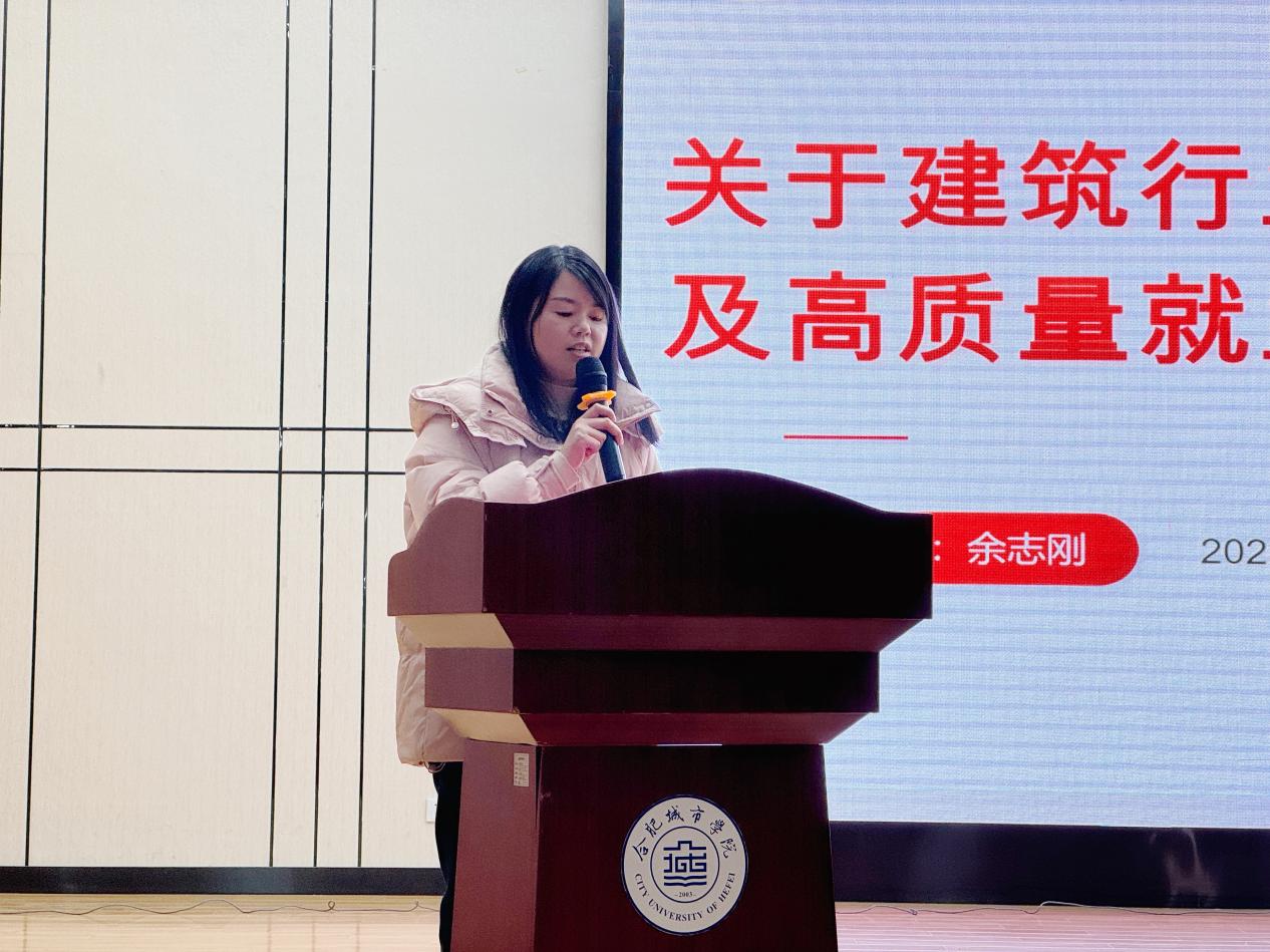 余志刚分别从建筑行业的现状、未来的总趋势和行业热点,并根据企业规模、专业类别、经营范围、资质条件、股权性质将建筑行业进行分类,从最关注的央企国企着手,着重介绍建筑行业未来发展的精细化、低碳化、产业化、数字化、智能化和新融资化的趋势。为提高学生对未来就业企业的认识,余志刚还详细介绍了安徽建工集团的架构图和近三年的招聘整体情况,并将招聘的关注点摘要提取供学生参考准备。