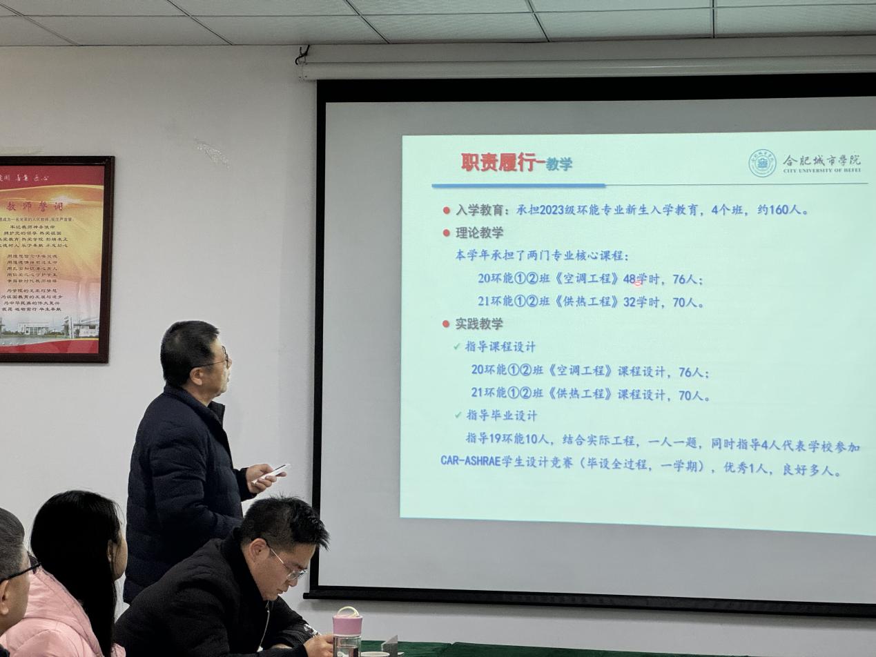 会上,环能专业带头人王晏平副教授从教学工作、专业建设、实验室建设、教科研工作、师资培养、学科竞赛、就业创业等方面内容进行汇报,力学课程带头人张速副教授围绕课程建设、实践教学建设、教科研及相关工作、师资队伍建设等方面重点介绍,两位带头人采用PPT展示与述职相结合的方式,客观、全面汇报一年来的工作情况。