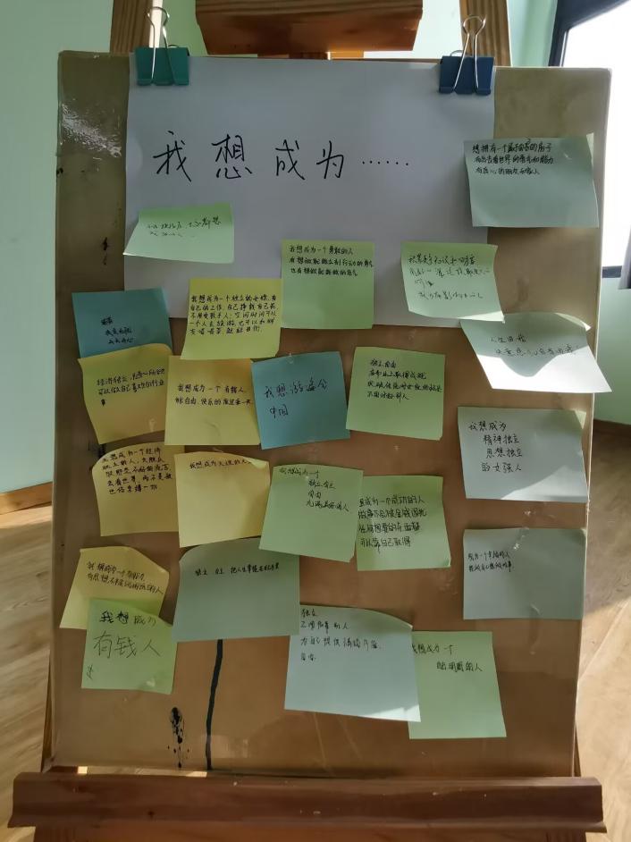李慧和刘婧老师与同学们一起列举了一些做出杰出贡献、活出自我的女性的例子,如张桂梅、屠呦呦、华春莹和女排姑娘们等。大家也深受鼓舞,依次撕下了贴在画板上所写的各种标签,贴上了新的承载着自己美好愿望的便签。