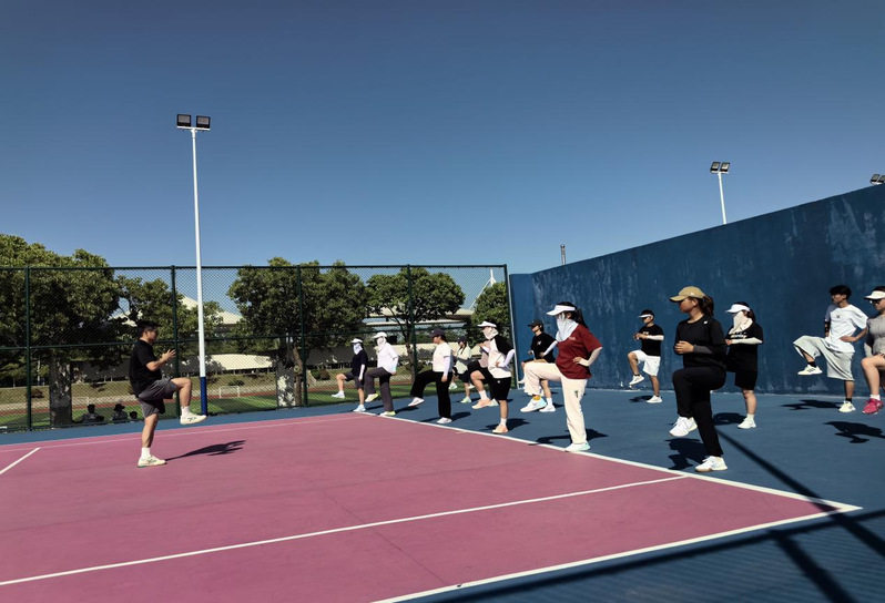 在历时三个小时的网球专项体能训练中,王伟明教练分别从热身准备、网球步伐、身体稳定性等全方位对校队队员进行指导。