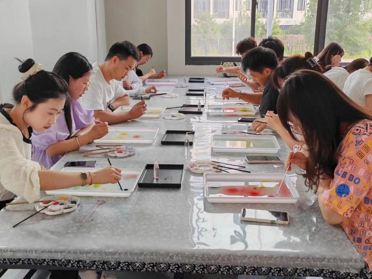 流沙笺制作体验带领同学们走进纸笺加工技艺的世界,在亲手调色作画的过程中,一笔一烙留住中国精神,一渲一染传递华夏文化。让同学们们感受千年前中国能工巧匠创作出的彩笺之美,体会到非遗艺术的魅力,在潜移默化是过程中让非遗传承的种子在心中生根发芽。