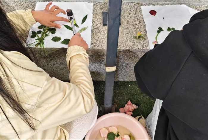 此次活动可以引导学生发现自然之美,感受植物与生活融合的魅力。植物成为了我们生活中不可或缺的一部分,给我们带来了视觉盛宴,可以让大家了解到非遗传统文化。活动一开始,可以去室外采摘新鲜的叶片,进行创作。随后在志愿者的指导下进行植物拓染。志愿者们向同学们详细科普了植物拓印的由来和做法,并发放了白色帆布包、胶带、花卉植物、小锤子,小盆等拓印工具。在志愿者的耐心指导下,同学们小心翼翼地将植物摆放在白色帆布包上,用胶带固定位置,然后拿起小锤子轻轻敲打。一时间,清脆的敲打声在空气中交织,像是一场独特的音乐会。随着敲打,植物的汁液慢慢渗出,在布料上留下了它们美丽的印记。有的参与者选择用多种植物组合,创造出一幅色彩绚丽、图案丰富的画面,宛如一幅生动的自然画卷;有的则专注于一种植物,通过不同力度的敲打,展现出植物纹理的细腻之美。