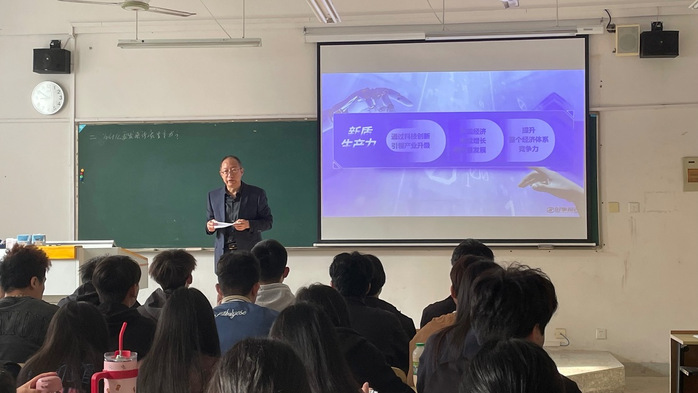 在课堂上,祝家贵以丰富的案例和生动的语言,生动讲解了发展新质生产力的重要性和思政课的使命。他鼓励学生们牢记初心使命,珍惜学习机会,努力培养科学素养和社会责任感,不断探索新质生产力的发展之路。