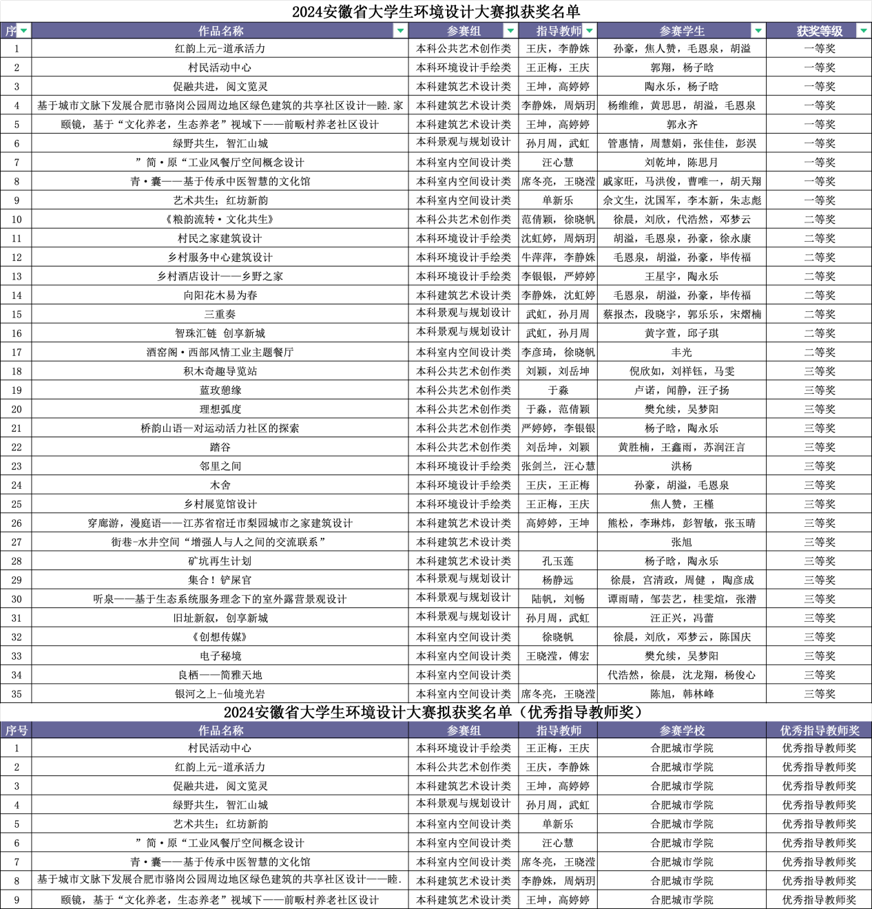 本网讯:近日,备受瞩目的2024年安徽省大学生环境设计大赛评审结果正式公布,我校学子凭借卓越的专业素养与创新设计能力,共荣获44个奖项,其中包括一等奖9项、二等奖8项、三等奖18项,以及优秀指导教师奖9项。