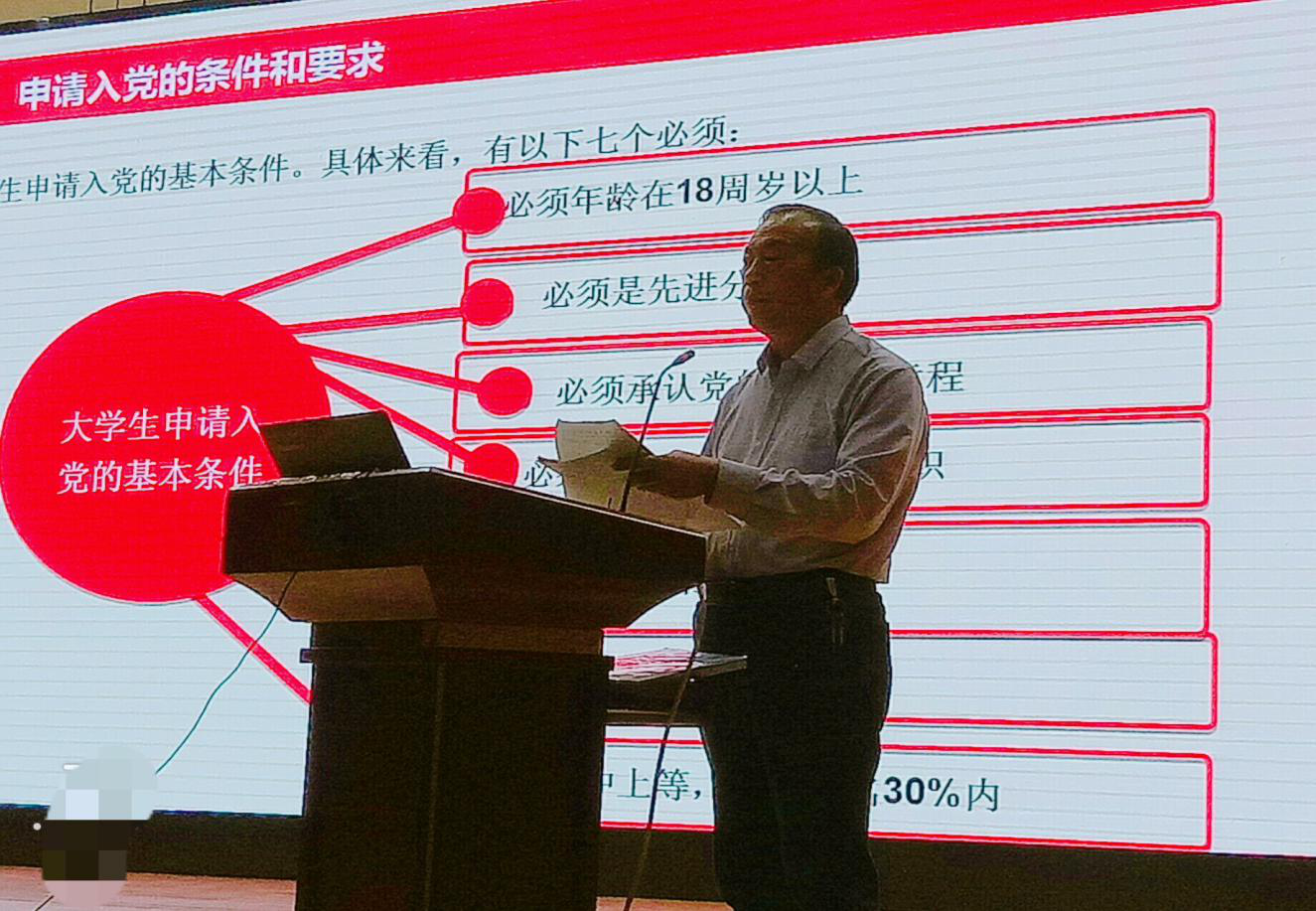 魏宪友副书记首先介绍了大学生入党的基本条件和要求,从写入党申请书到步入党积极分子再到最后成为发展对象,其中的程序繁多、条件要求严格,更加体现了中国共产党的神圣与纯洁性。 接着详述了党员的发展流程,严格把关入党程序,发展中坚持“十六字”原则,以硬性条件严格筛选发展党员,这是学院党委、更是上级党组织对我们的严格要求。教育学员们要以“四个意识”武装头脑,“四个自信”明确目标,不断提高党性修养。 最后要求学员们以“八个带头”的行为准则来约束自己的日常行为,端正入党动机,严格规范自己的言行,为加入党组织积极创造条件。魏宪友副书记的谆谆教诲让学员们在内心深处更加端正了学习态度,以严格的标准要求自己,不负老师、不负党组织的众望。