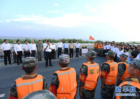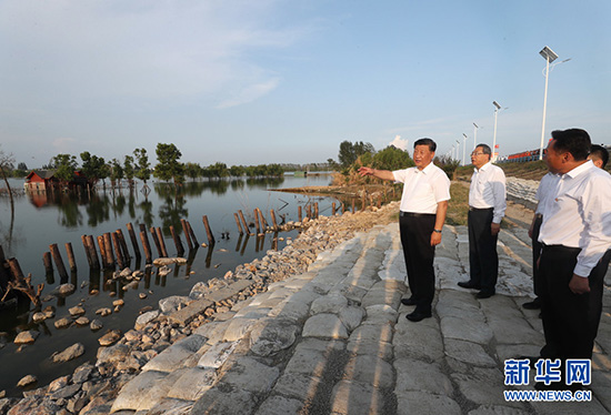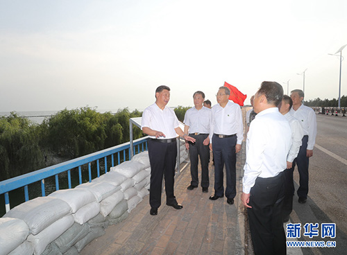 8月18日至21日,中共中央总书记、国家主席、中央军委主席习近平在安徽省考察。这是19日下午,习近平在合肥市肥东县十八联圩生态湿地蓄洪区巢湖大堤罗家疃段考察,了解巢湖主要圩口分洪和蓄洪区受灾情况。 新华社记者 王晔 摄 19日下午,习近平来到合肥市肥东县十八联圩生态湿地蓄洪区巢湖大堤罗家疃段考察。今年入汛以来,巢湖水位多次突破历史极值,合肥市主动启用十八联圩及周边圩区蓄洪。习近平仔细察看巢湖水势水情,听取环巢湖主要圩口分洪及周边湿地蓄洪、巢湖综合治理情况汇报,了解防汛物资和大堤加固情况。他强调,要坚持湿地蓄洪区的定位和规划,尽快恢复生态湿地蓄洪区的行蓄洪功能和生态保护功能。他指出,当前,南方有关地方要继续抓好防汛救灾工作,同时要严防次生灾害。北方有关地方要对可能发生的汛情加强警戒和防范,全面落实防汛救灾各项工作,确保安全度汛,确保人民群众生命财产安全。