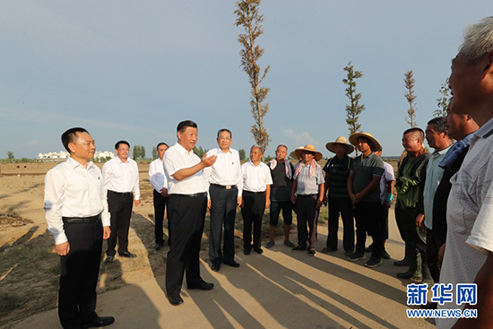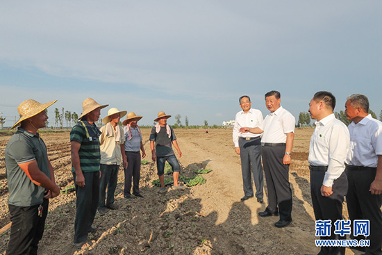 8月18日至21日,中共中央总书记、国家主席、中央军委主席习近平在安徽省考察。这是18日下午,习近平在阜阳市阜南县蒙洼蓄洪区,同正在退水地块补种蔬菜的乡亲们亲切交流。 新华社记者 鞠鹏 摄