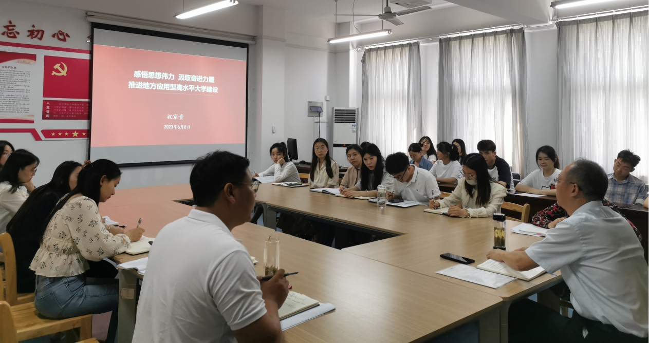 祝家贵以“感悟思想伟力,汲取奋进力量,推进地方应用型高水平大学建设”为题,从主题教育的总要求和根本任务出发,结合经济与管理学院专业建设、人才培养、师资队伍等实际情况,就学习贯彻习近平新时代中国特色社会主义思想,围绕“深刻把握习近平新时代中国特色社会主义思想的理论体系和世界观方法论、深刻把握习近平总书记关于教育的重要论述、以主题教育凝心聚力推动星空在线注册(中国)官方网站-注册登录事业高质量发展”三个方面的内容进行了重点阐述。