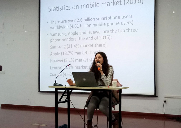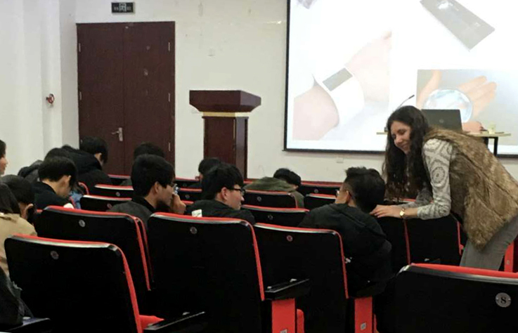 Aga以欢快互动的氛围引出本期主题——“Iphone & Other Telephone Brands in China”,她分别讲述了手机的发展史、在日常使用中的利弊以及未来的发展趋势。期间,Aga博士鼓励同学们分成若干讨论小组,请大家围绕话题各抒己见。