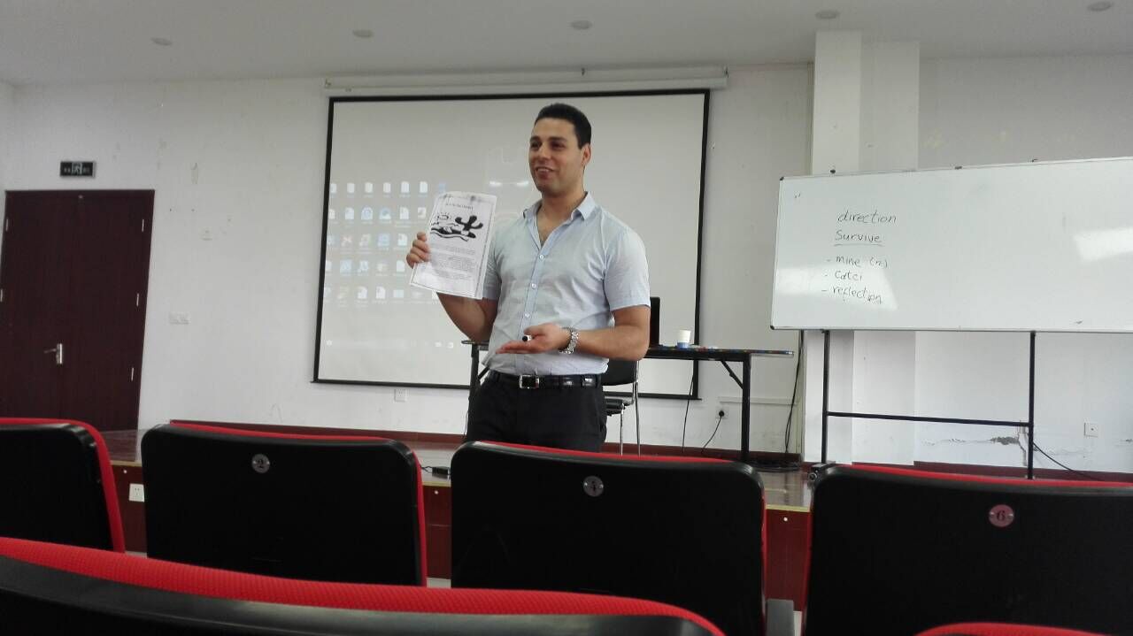 此次英语角活动的主题是"How to adapt to foreign life?"(如何适应国外生活)。开课前,大家互相做了自我介绍,Mike博士的幽默风趣立刻拉近了与同学们的距离。轻松的氛围下,Mike自然的引出“到国外学习或生活应该具备什么”的讨论话题,这个话题,使同学们认识到出国学习需要的不仅仅是语言能力,更是各方面技能及综合素养的考量。各小组纷纷积极发言,展开了热烈的讨论。活动的最后一项,Mike博士还精心为同学们准备了一份内容丰富的阅读材料,同学们就阅读上的课题Lost In The Desert(荒漠迷途),进行了一场“辩论赛”式的讨论,是不是听起来就令人跃跃欲试呢?!