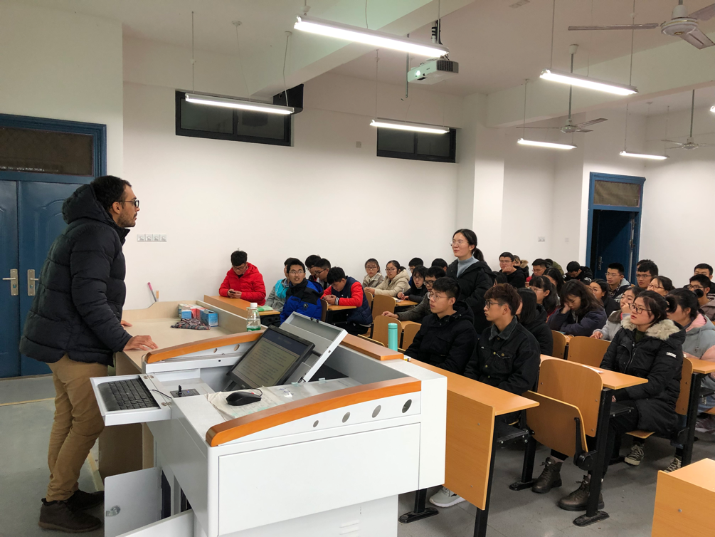 12月6日下午1:50许,安徽建筑大学城市建设学院本学期第四次的英语角活动准时开始。本次英语角活动由我院对外合作处主办,英语协会承办,出席嘉宾依然是同学们熟悉的Kevin博士。又一次见到Kevin博士的同学们显得尤为热情,教室也是座无虚席。