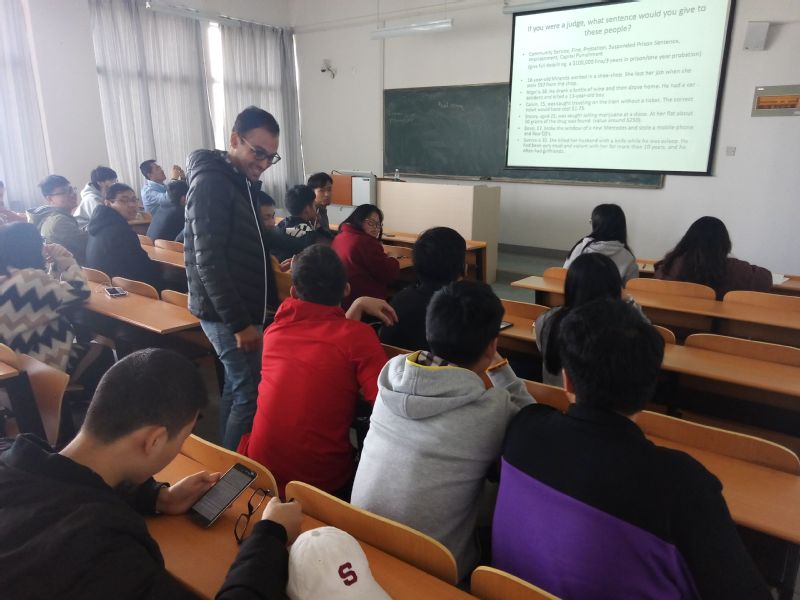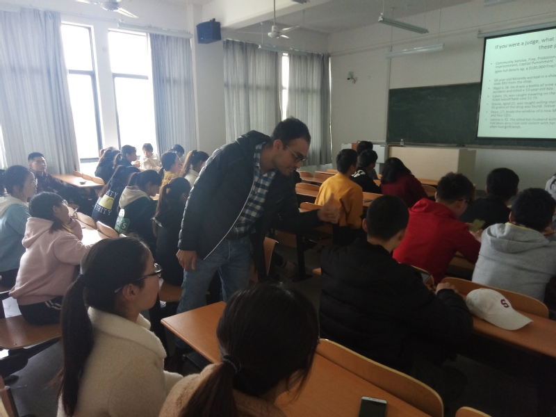 活动开始,Kevin博士首先回顾了上次英语角所讨论的内容,随后又给大家介绍了一些西方国家的罪行判决和其相关的实施方式,紧接着Kevin博士通过PPT展示了一些犯罪罪行并邀请同学们互动,假设你是法官的话,你将如何给他们相应的惩罚?同学们各抒己见,课堂气氛顿时活跃了起来。之后又和同学们讨论了一个报告上报道了人们认为拘留并不是解决罪行的最佳选择,并展示了社会各界人士的看法。最后他邀请同学谈谈身边的一些罪行,并告诫大家不要以身试法,要做一名合格公民。