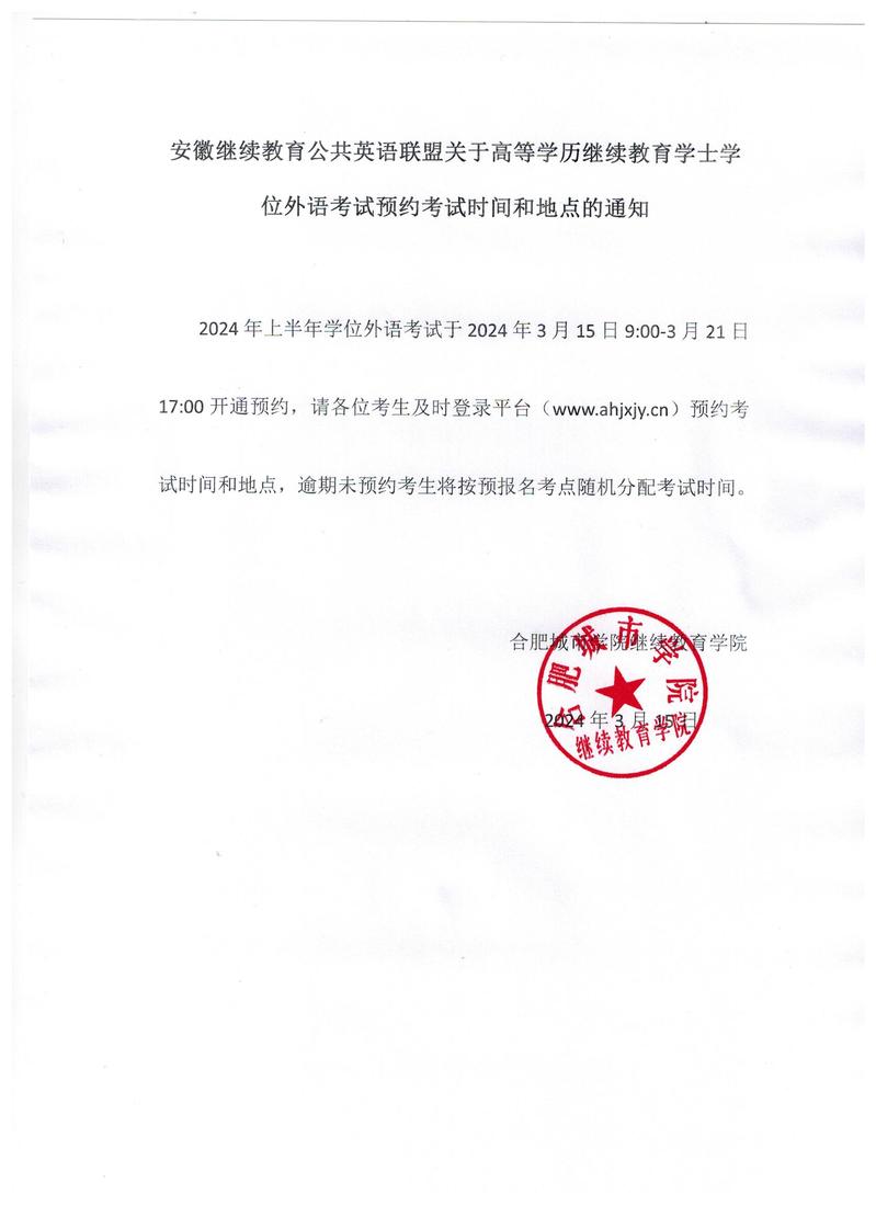 安徽继续教育公共英语联盟关于高等学历继续教育学士学位外语考试预约考试时间和地点的通知
