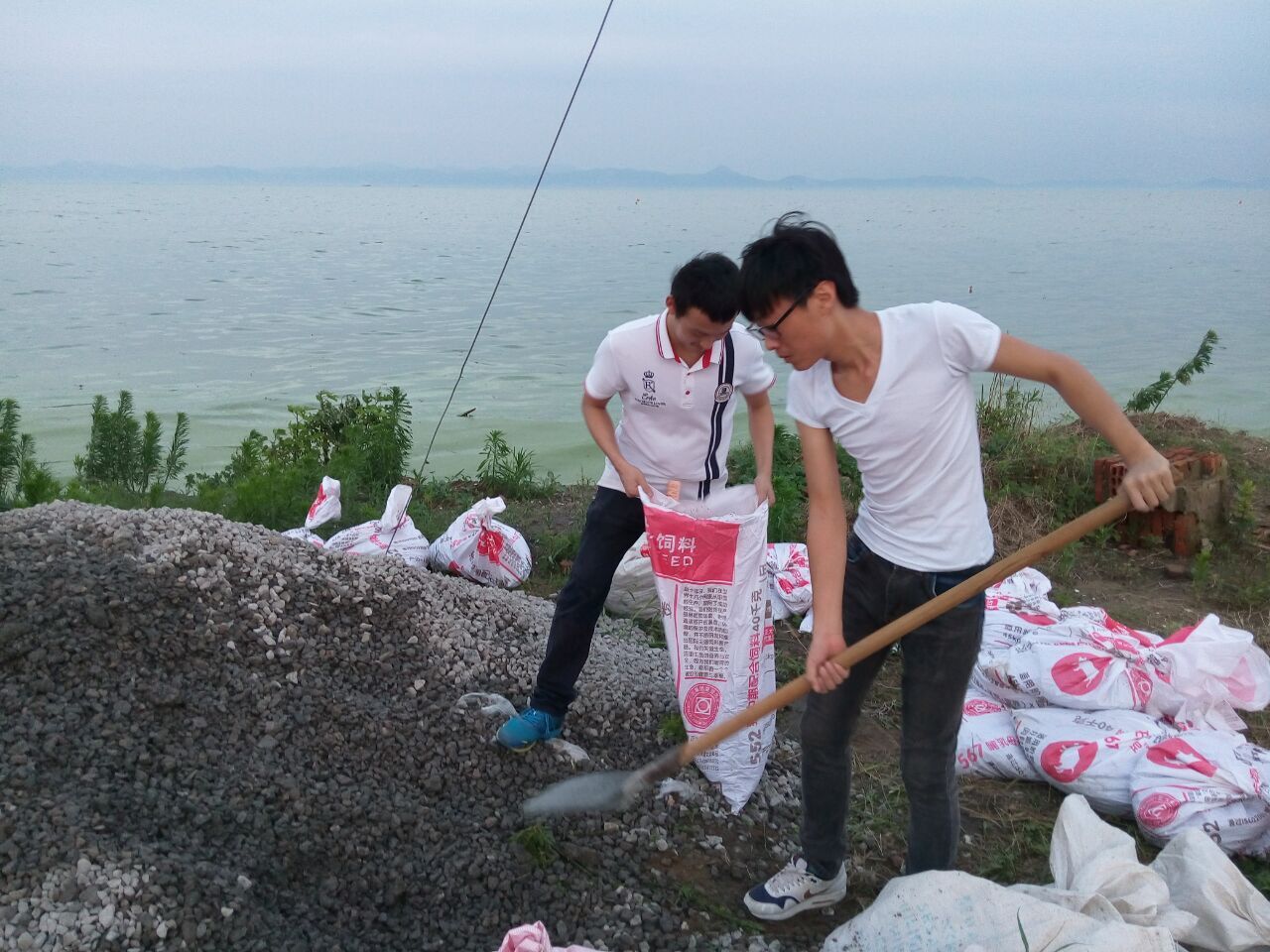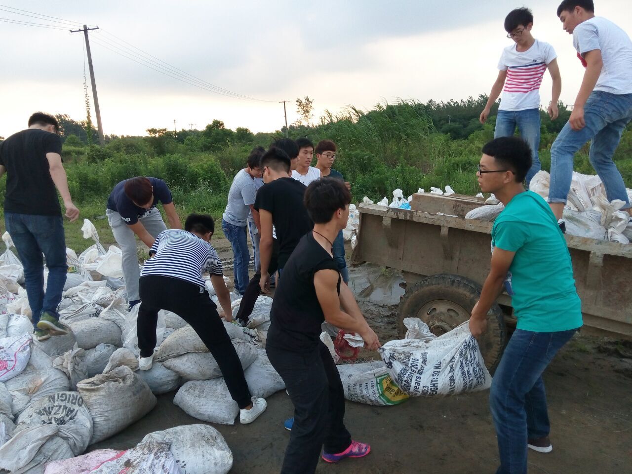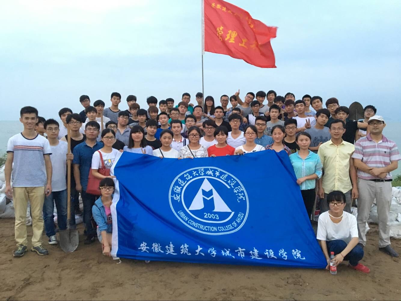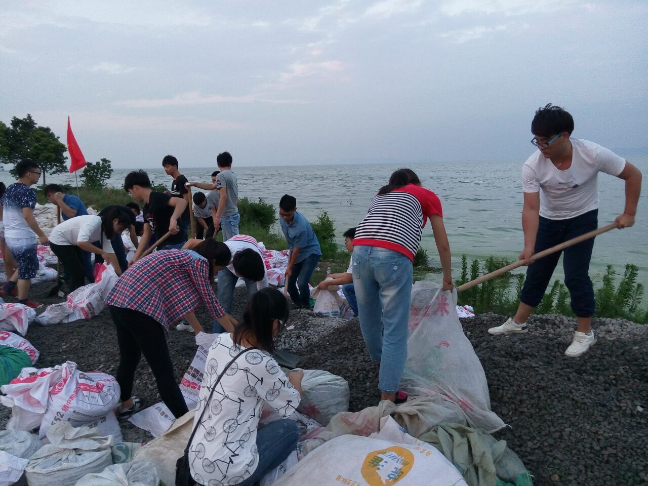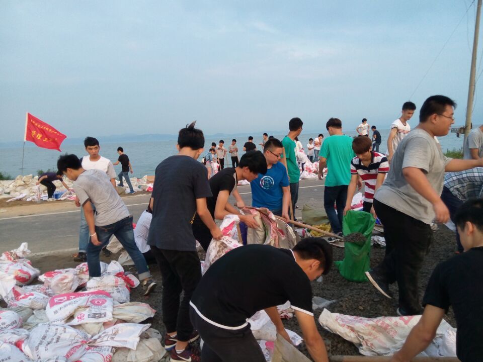 7月7号下午,在管理工程系学生会的组织下,下午六时许在图书馆门口,汇集了60余名心怀受灾人民的同学,他们在学生处副处长林岳和辅导员葛英刚老师的带领下,到巢湖边装运防汛袋,他们相互配合,相互帮助,沙石在汗湿的衣服上,脸上流着豆粒般大小汗珠,更有同学为第一时间去往救灾没有吃饭,齐心协力援助灾区。虽然我们不能像解放军一样冲到前线,但我们要成为灾区人民强有力的后盾。