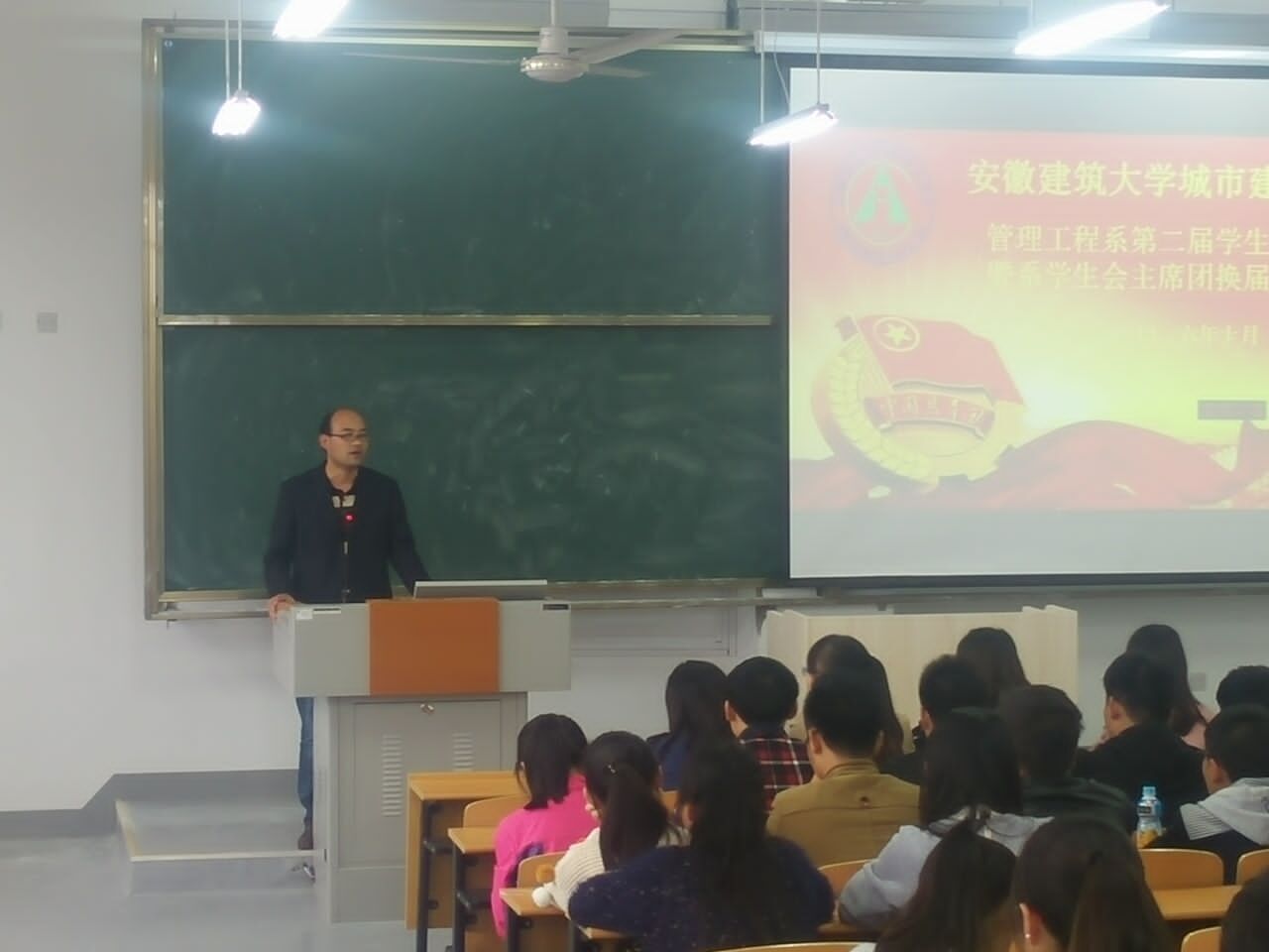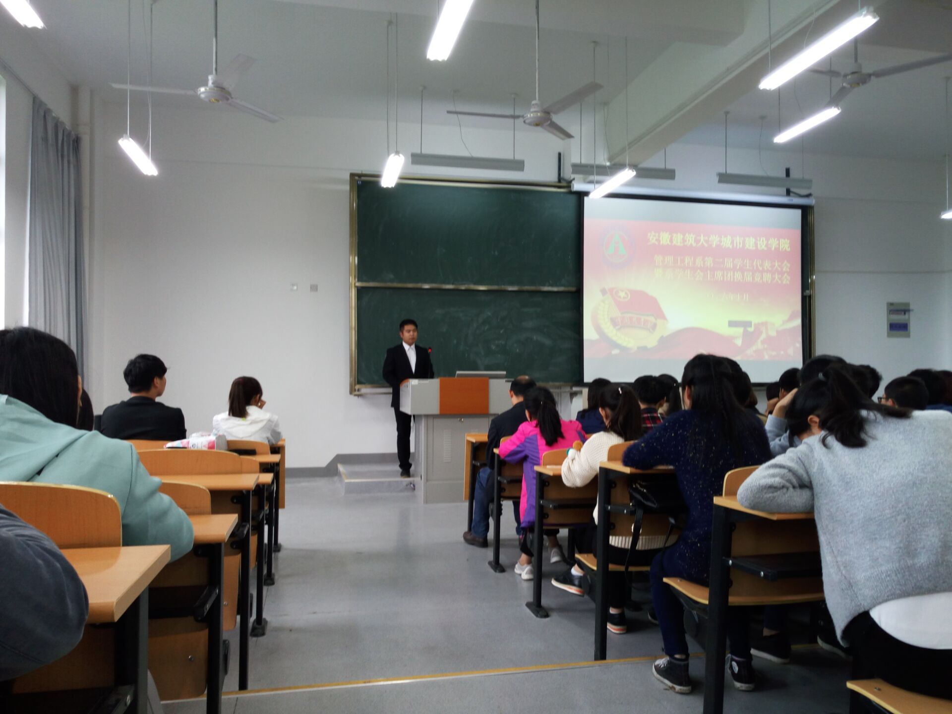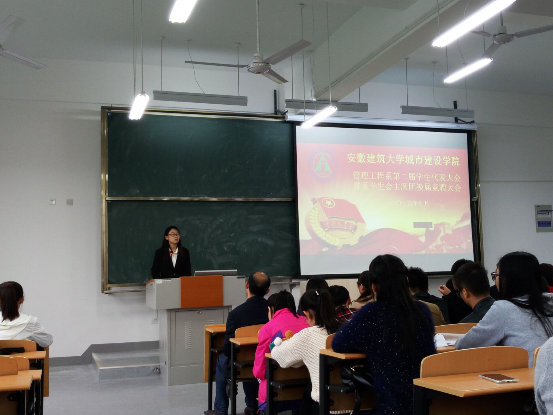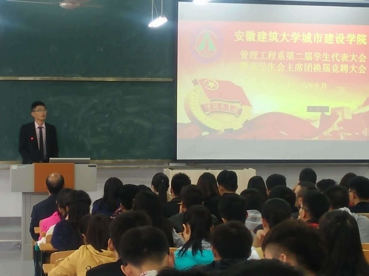倾注于充溢着祥和的旋律,回放青春时光。时光荏苒,转眼间一年已经结束。10月21日中午12点30分,管理工程系第二届学生代表大会暨学生会主席团换届竞聘大会在南教208教室隆重举行。开始之前,很多学生代表都早早的到了教室参加大会。受邀参加本次会议有学生处处长王利康、院团委副书记唐玮老师、系主任助理王清老师和我系各年级辅导员老师,他们纷纷莅临现场,高度关心我系学生工作。
