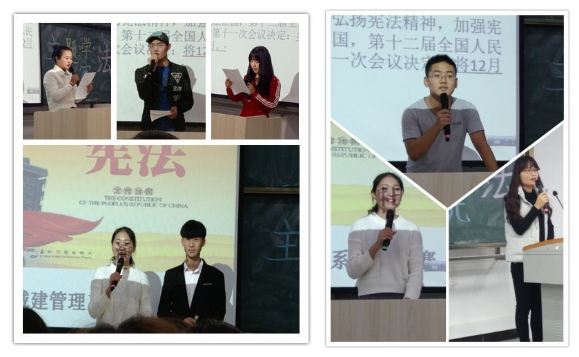 管理系的选手们激情演讲,使人心潮澎湃。3号选手使用了符合大学生的方法,诠释了宪法的实用性,使人一听就懂,获得了大家的一致认同。第10号选手则用真实的例子,说明宪法的重要性,让我们深深的体验宪法的真实感。第21号选手不走寻常路,以最平凡的方式,将自己心中的“宪法”展示给大家,也因此得到了如潮般的掌声。其它同学各有千秋,足以见得宪法在我们心中的地位。