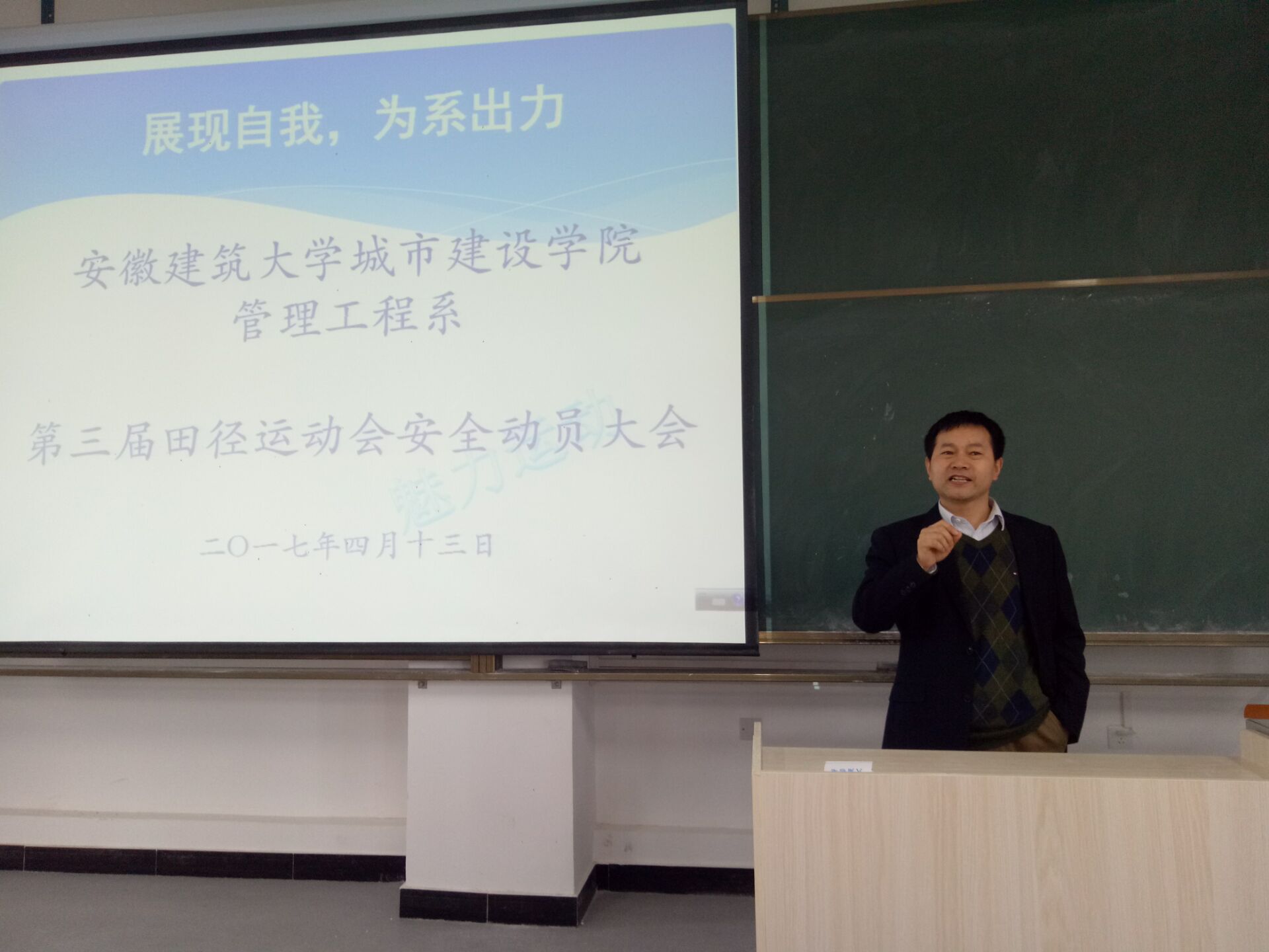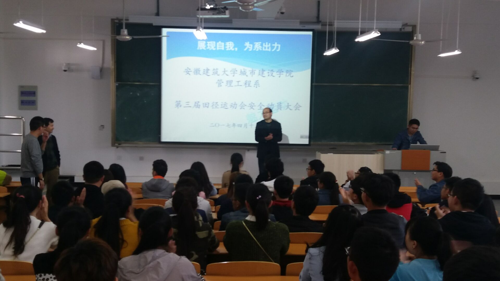 4月13日下午1点半,在欢快的运动员进行曲中,管理工程系召开了第三届田径运动会安全动员大会。所有管理工程系参赛运动员以及各班班长、团支书、体委悉数到场。会议由系主任助理葛英刚老师主持,管理系主任曹泽主任、管理系党支部书记张荣荣老师、管理系团总支部书记周琪老师、辅导员张计超老师参加大会。