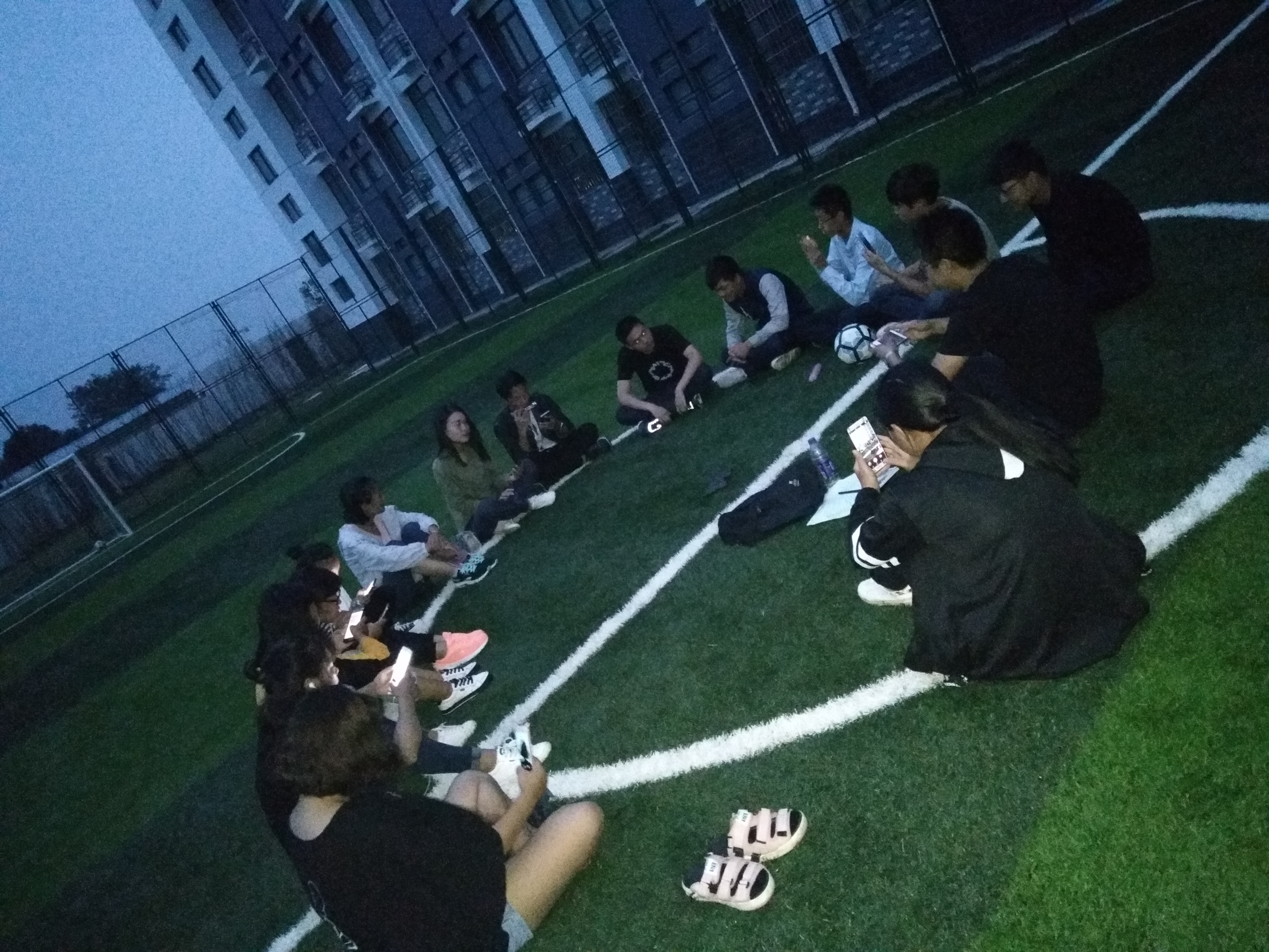 2017年10月1日傍晚,在7号楼下的足球场中央,二十余人围成的一个圈,大家在轮流自我介绍。走进一看,原来是管理系和机电的17级新生辅导员张老师组织国庆节没有回家的学生在此聚会。