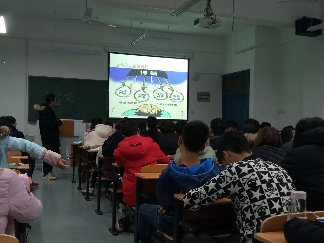 在当今社会,传销一词被越来越多的人提及,也引发了不少的热议。形形色色的传销平台打着“享受生活”的噱头来误导大学生。辅导员张老师积极引导各班学生积极组织健康向上活动,为使工程造价专业,资产评估专业全体同学知道传销的危害,工程造价专业,资产评估专业于12月19日在南教205开展了以“大学生警惕传销陷阱”为主题的班会。