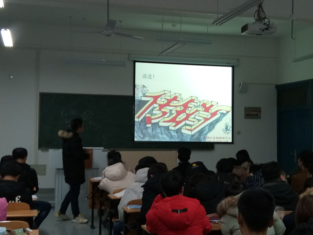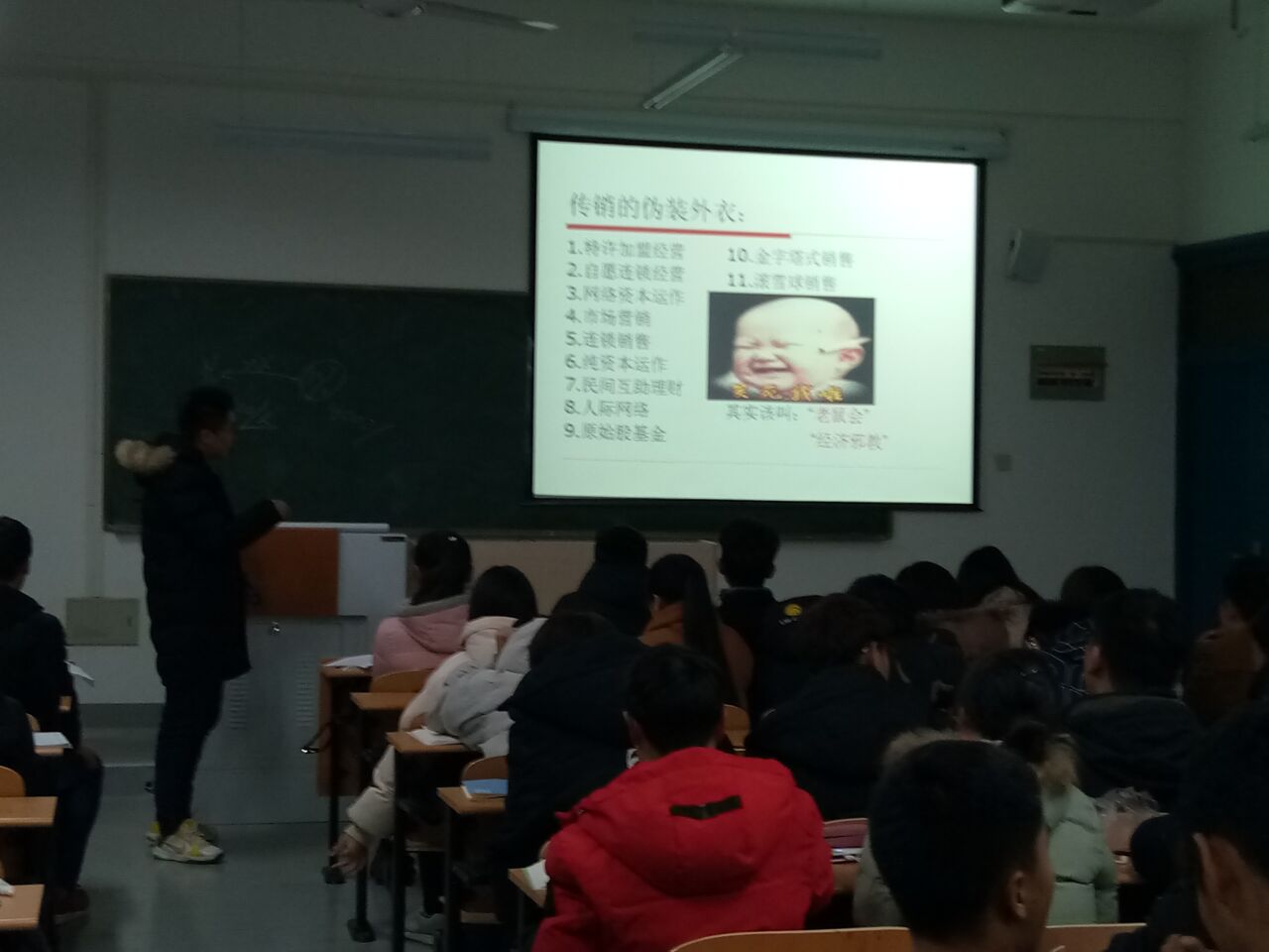 张洲老师首先像同学们说明什么是传销,让学生对传销有更深的认识,加强防范意识,掌握有关防传销知识。并且用具体实例告诉同学们有一些传销打着花里胡哨的噱头,而背后确隐藏着一把尖刀。让学生了解传销的危害,一定要对传销保持高度警惕。
