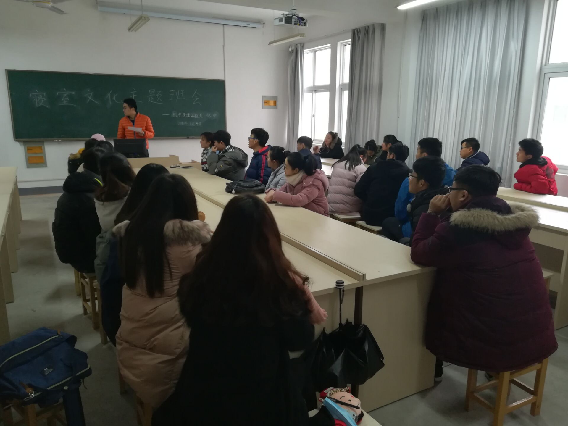 寝室是大学生在校期间学习、生活和人际交往的重要场所,不仅是学生疲惫时的归巢,同时也是思想交流,相互沟通的港湾。营造和谐的寝室风不仅可以促进整个校园学风的建设,而且也直接关系着大学生的身心健康,对大学生自身的人格塑造、个性发展也有着积极的作用,为此辅导员张老师特于1月4日在实验楼404对各班班委和宿舍长召开了关于共建寝室文化的主题班会。